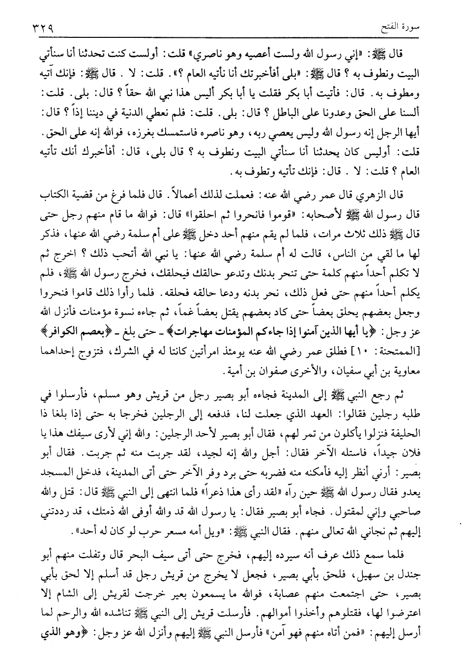 قال صلى الله عليه وسلم: «إِنِّي رَسُولُ اللَّهِ وَلَسْتُ أَعْصِيهِ وَهُوَ نَاصِرِي» قلت: أو لست كُنْتَ تُحَدِّثُنَا أَنَّا سَنَأْتِي الْبَيْتَ وَنَطُوفُ بِهِ؟ قال صلى الله عليه وسلم: «بَلَى أَفَأَخْبَرْتُكَ أَنَّا نَأْتِيهِ الْعَامَ؟» . قُلْتُ: لَا. قال صلى الله عليه وسلم: فَإِنَّكَ آتِيهِ وَمُطَوِّفٌ بِهِ. قَالَ: فَأَتَيْتُ أَبَا بَكْرٍ فَقُلْتُ يَا أَبَا بَكْرٍ أَلَيْسَ هَذَا نَبِيَّ اللَّهِ حَقًّا؟ قَالَ: بَلَى. قُلْتُ: