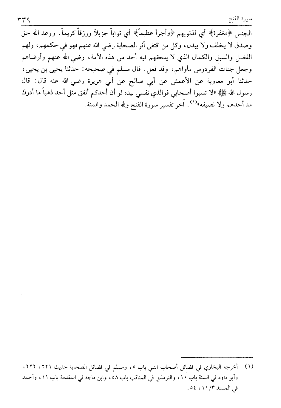 الْجِنْسِ مَغْفِرَةً أَيْ لِذُنُوبِهِمْ وَأَجْراً عَظِيماً أَيْ ثَوَابًا جَزِيلًا وَرِزْقًا كَرِيمًا. وَوَعْدُ اللَّهِ حَقٌّ وَصِدْقٌ لَا يُخْلَفُ وَلَا يُبَدَّلُ، وَكُلُّ مَنِ اقتفى أثر الصحابة رضي الله عنهم فَهُوَ فِي حُكْمِهِمْ، وَلَهُمُ الْفَضْلُ وَالسَّبْقُ وَالْكَمَالُ الَّذِي لَا يَلْحَقُهُمْ فِيهِ أَحَدٌ مِنْ هَذِهِ الْأُمَّةِ، رَضِيَ اللَّهُ عَنْهُمْ وَأَرْضَاهُمْ وَجَعَلَ جَنَّاتِ الْفِرْدَوْسِ مَأْوَاهُمْ، وَقَدْ فَعَلَ. قَالَ مُسْلِمٌ فِي صَحِيحِهِ: حَدَّثَنَا يَحْيَى بْنُ يَحْيَى، حَدَّثَنَا أَبُو مُعَاوِيَةَ عَنِ الْأَعْمَشِ عَنْ أَبِي صَالِحٍ عَنْ أَبِي هُرَيْرَةَ رَضِيَ اللَّهُ عَنْهُ قَالَ: قَالَ رَسُولُ اللَّهِ صَلَّى اللَّهُ عَلَيْهِ وَسَلَّمَ «لا تسبوا أصحابي فو الذي نَفْسِي بِيَدِهِ لَوْ أَنَّ أَحَدَكُمْ أَنْفَقَ مِثْلَ أُحُدٍ ذَهَبًا مَا أَدْرَكَ مُدَّ أَحَدِهِمْ وَلَا نَصِيفَهُ» «1» . آخِرُ تَفْسِيرِ سُورَةِ الْفَتْحِ وَلِلَّهِ الْحَمْدُ والمنة.