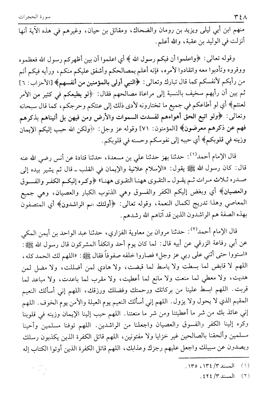قَالَ الْإِمَامُ أَحْمَدُ «1» : حَدَّثَنَا بَهْزٌ حَدَّثَنَا عَلِيُّ بْنُ مَسْعَدَةَ، حَدَّثَنَا قَتَادَةُ عَنْ أَنَسٍ رَضِيَ اللَّهُ عَنْهُ قَالَ: كَانَ رَسُولُ اللَّهِ صَلَّى اللَّهُ عَلَيْهِ وَسَلَّمَ يَقُولُ: «الْإِسْلَامُ عَلَانِيَةً وَالْإِيمَانُ فِي الْقَلْبِ- قَالَ ثُمَّ يُشِيرُ بِيَدِهِ إِلَى صَدْرِهِ ثَلَاثَ مَرَّاتٍ ثُمَّ يَقُولُ- التَّقْوَى هَاهُنَا التَّقْوَى هَاهُنَا» وَكَرَّهَ إِلَيْكُمُ الْكُفْرَ وَالْفُسُوقَ وَالْعِصْيانَ أَيْ وَبَغَّضَ إِلَيْكُمُ الْكُفْرَ وَالْفُسُوقَ وَهِيَ الذُّنُوبُ الْكِبَارُ وَالْعِصْيَانَ، وَهِيَ جَمِيعُ الْمَعَاصِي وَهَذَا تدريج لكمال النعمة، وقوله تعالى: أُولئِكَ هُمُ الرَّاشِدُونَ أَيِ الْمُتَّصِفُونَ بِهَذِهِ الصِّفَةِ هُمُ الرَّاشِدُونَ الَّذِينَ قَدْ آتَاهُمُ اللَّهُ رُشْدَهُمْ.