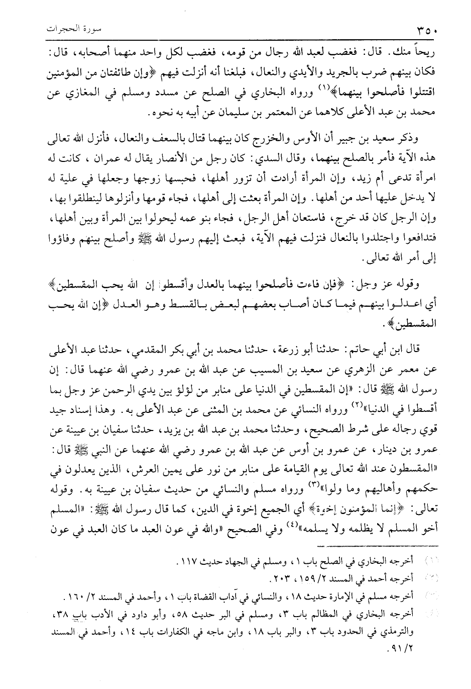 «المقسطون عند الله تعالى يَوْمَ الْقِيَامَةِ عَلَى مَنَابِرَ مِنْ نُورٍ عَلَى يَمِينِ الْعَرْشِ، الَّذِينَ يَعْدِلُونَ فِي حُكْمِهِمْ وَأَهَالِيهِمْ وَمَا وَلُوا» «3» وَرَوَاهُ مُسْلِمٌ وَالنَّسَائِيُّ مِنْ حَدِيثِ سُفْيَانَ بْنِ عُيَيْنَةَ بِهِ. وقوله تعالى: إِنَّمَا الْمُؤْمِنُونَ إِخْوَةٌ أَيِ الْجَمِيعُ إِخْوَةٌ فِي الدِّينِ، كَمَا قَالَ رَسُولُ اللَّهِ صَلَّى اللَّهُ عَلَيْهِ وَسَلَّمَ: «الْمُسْلِمُ أَخُو الْمُسْلِمِ لَا يَظْلِمُهُ وَلَا يُسْلِمُهُ» «4» وَفِي الصَّحِيحِ «وَاللَّهُ فِي عَوْنِ الْعَبْدِ مَا كَانَ الْعَبْدُ في عون