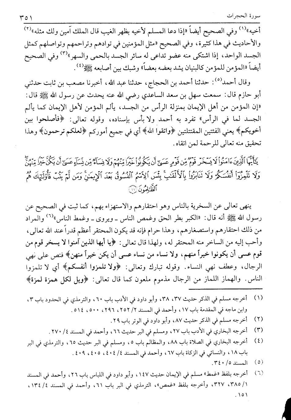 يا أَيُّهَا الَّذِينَ آمَنُوا لا يَسْخَرْ قَوْمٌ مِنْ قَوْمٍ عَسى أَنْ يَكُونُوا خَيْراً مِنْهُمْ وَلا نِساءٌ مِنْ نِساءٍ عَسى أَنْ يَكُنَّ خَيْراً مِنْهُنَّ وَلا تَلْمِزُوا أَنْفُسَكُمْ وَلا تَنابَزُوا بِالْأَلْقابِ بِئْسَ الاسْمُ الْفُسُوقُ بَعْدَ الْإِيمانِ وَمَنْ لَمْ يَتُبْ فَأُولئِكَ هُمُ الظَّالِمُونَ (11)