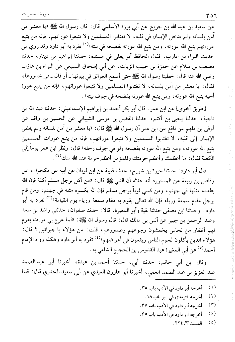 عَنْ سَعِيدِ بْنِ عَبْدِ اللَّهِ بْنِ جُرَيْجٍ عَنْ أَبِي بَرْزَةَ الْأَسْلَمِيِّ قَالَ: قَالَ رَسُولُ اللَّهِ صَلَّى اللَّهُ عَلَيْهِ وَسَلَّمَ «يَا مَعْشَرَ من آمن بلسانه ولم يدخل الإيمان في قلبه، لا تغتابوا المسلمين ولا تتبعوا عوراتهم، فَإِنَّهُ مَنْ يَتْبَعْ عَوْرَاتِهِمْ يَتْبَعِ اللَّهُ عَوْرَتَهُ، وَمَنْ يَتْبَعِ اللَّهُ عَوْرَتَهُ يَفْضَحْهُ فِي بَيْتِهِ» «1» تَفَرَّدَ بِهِ أَبُو دَاوُدَ وَقَدْ رُوِيَ مِنْ حَدِيثِ الْبَرَاءِ بْنِ عَازِبٍ. فَقَالَ الْحَافِظُ أَبُو يَعْلَى فِي مُسْنَدِهِ: حَدَّثَنَا إِبْرَاهِيمُ بْنُ دِينَارٍ، حَدَّثَنَا مُصْعَبُ بْنُ سَلَّامٍ عَنْ حَمْزَةَ بْنِ حَبِيبٍ الزَّيَّاتِ، عَنْ أَبِي إِسْحَاقَ السَّبِيعِيِّ عَنِ الْبَرَاءِ بْنِ عَازِبٍ رَضِيَ اللَّهُ عَنْهُ قَالَ: خَطَبَنَا رَسُولُ اللَّهِ صَلَّى اللَّهُ عَلَيْهِ وَسَلَّمَ حَتَّى أَسْمَعَ الْعَوَاتِقَ فِي بُيُوتِهَا- أَوْ قَالَ- فِي خُدُورِهَا، فَقَالَ: يَا مَعْشَرَ مَنْ آمَنَ بِلِسَانِهِ، لَا تَغْتَابُوا المسلمين ولا تتبعوا عوراتهم، فإنه من يتبع عَوْرَةَ أَخِيهِ يَتْبَعِ اللَّهُ عَوْرَتَهُ، وَمَنْ يَتْبَعِ اللَّهُ عَوْرَتَهُ يَفْضَحْهُ فِي جَوْفِ بَيْتِهِ» .