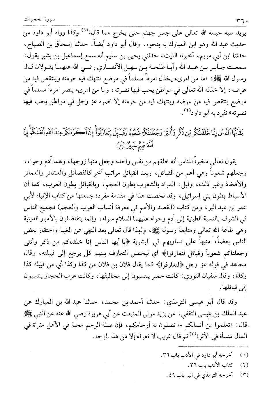 يَقُولُ تَعَالَى مُخْبِرًا لِلنَّاسِ أَنَّهُ خَلَقَهُمْ مِنْ نَفْسٍ وَاحِدَةٍ وَجَعَلَ مِنْهَا زَوْجَهَا، وَهُمَا آدَمُ وَحَوَّاءُ، وَجَعَلَهُمْ شُعُوبًا وَهِيَ أَعَمُّ مِنَ الْقَبَائِلِ، وَبَعْدَ الْقَبَائِلِ مَرَاتِبُ أُخَرُ كَالْفَصَائِلِ وَالْعَشَائِرِ وَالْعَمَائِرِ وَالْأَفْخَاذِ وَغَيْرِ ذَلِكَ، وَقِيلَ: الْمُرَادُ بِالشُّعُوبِ بُطُونُ الْعَجَمِ، وَبِالْقَبَائِلِ بُطُونُ الْعَرَبِ، كَمَا أَنَّ الْأَسْبَاطَ بُطُونُ بَنِي إِسْرَائِيلَ، وَقَدْ لَخَّصْتُ هَذَا فِي مُقَدِّمَةٍ مُفْرَدَةٍ جَمَعْتُهَا مِنْ كِتَابِ الْإِنْبَاهِ لِأَبِي عُمَرَ بْنِ عَبْدِ الْبَرِّ، وَمِنْ كِتَابِ (الْقَصْدِ وَالْأُمَمِ فِي مَعْرِفَةِ أَنْسَابِ الْعَرَبِ وَالْعَجَمِ) فَجَمِيعُ النَّاسِ فِي الشَّرَفِ بِالنِّسْبَةِ الطِّينِيَّةِ إِلَى آدَمَ وحواء عليهما السلام سَوَاءٌ، وَإِنَّمَا يَتَفَاضَلُونَ بِالْأُمُورِ الدِّينِيَّةِ وَهِيَ طَاعَةُ الله تعالى وَمُتَابَعَةُ رَسُولِهِ صَلَّى اللَّهُ عَلَيْهِ وَسَلَّمَ، وَلِهَذَا قَالَ تَعَالَى بَعْدَ النَّهْيِ عَنِ الْغَيْبَةِ وَاحْتِقَارِ بَعْضِ النَّاسِ بَعْضًا، مُنَبِّهًا عَلَى تَسَاوِيهِمْ فِي الْبَشَرِيَّةِ يَا أَيُّهَا النَّاسُ إِنَّا خَلَقْناكُمْ مِنْ ذَكَرٍ وَأُنْثى وَجَعَلْناكُمْ شُعُوباً وَقَبائِلَ لِتَعارَفُوا أَيْ لِيَحْصُلَ التَّعَارُفُ بَيْنَهُمْ كُلٌّ يَرْجِعُ إِلَى قَبِيلَتِهِ، وقال مجاهد في قوله عز وجل لِتَعارَفُوا كَمَا يُقَالُ فُلَانُ بْنُ فُلَانٍ مِنْ كَذَا وَكَذَا أَيْ مِنْ قَبِيلَةِ كَذَا وَكَذَا، وَقَالَ سُفْيَانُ الثَّوْرِيُّ: كَانَتْ حِمْيَرُ يَنْتَسِبُونَ إِلَى مَخَالِيفِهَا، وَكَانَتْ عَرَبُ الْحِجَازِ يَنْتَسِبُونَ إِلَى قَبَائِلِهَا.