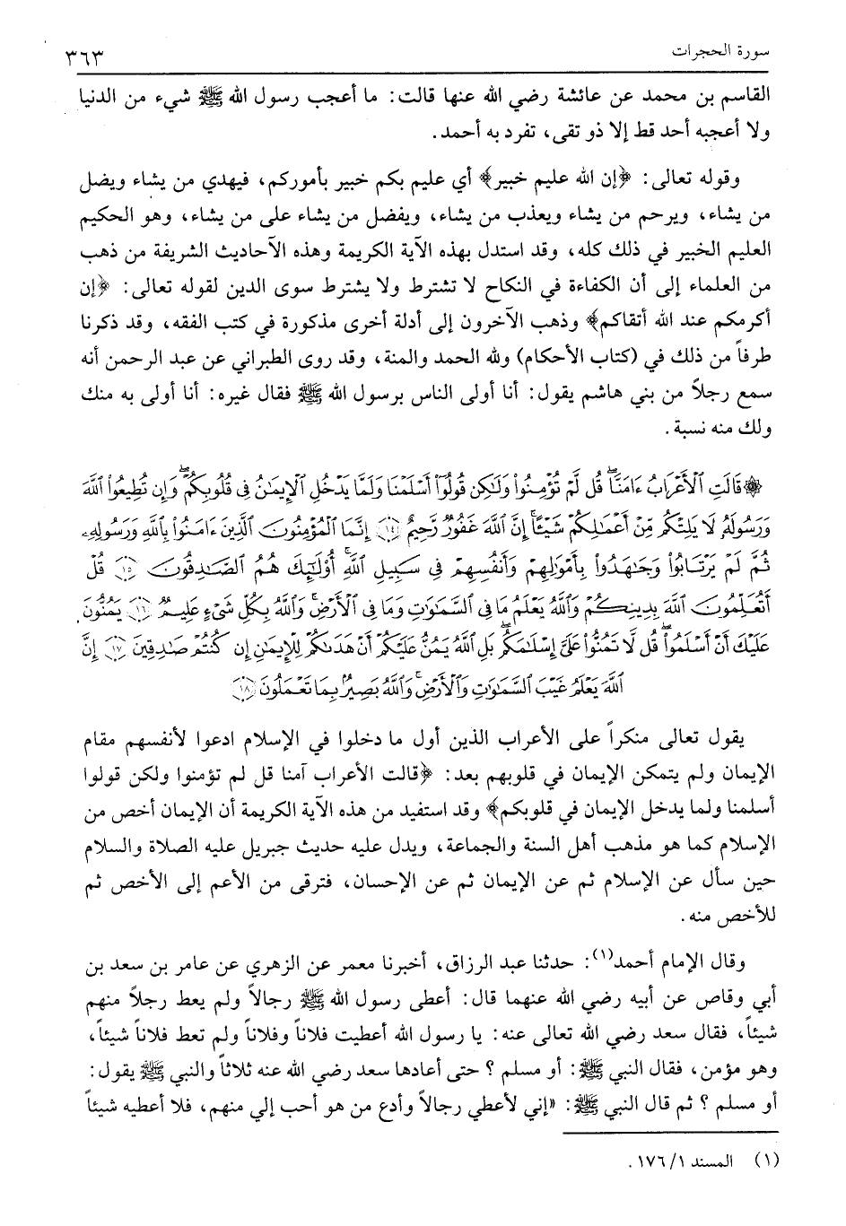 وَقَالَ الْإِمَامُ أَحْمَدُ «1» : حَدَّثَنَا عَبْدُ الرَّزَّاقِ، أَخْبَرَنَا مَعْمَرٌ عَنِ الزُّهْرِيِّ عَنْ عَامِرُ بْنُ سَعْدِ بْنِ أَبِي وَقَّاصٍ عَنْ أبيه رضي الله عنهما قَالَ: أَعْطَى رَسُولُ اللَّهِ صَلَّى اللَّهُ عَلَيْهِ وَسَلَّمَ رِجَالًا وَلَمْ يُعْطِ رَجُلًا مِنْهُمْ شَيْئًا، فقال سعد رَضِيَ اللَّهُ تَعَالَى عَنْهُ: يَا رَسُولَ اللَّهِ أَعْطَيْتَ فُلَانًا وَفُلَانًا وَلَمْ تُعْطِ فُلَانًا شَيْئًا، وَهُوَ مُؤْمِنٌ، فَقَالَ النَّبِيُّ صَلَّى اللَّهُ عَلَيْهِ وسلم: أو مسلم؟ حتى أعادها سعد رضي الله عنه ثَلَاثًا وَالنَّبِيُّ صَلَّى اللَّهُ عَلَيْهِ وَسَلَّمَ يَقُولُ: