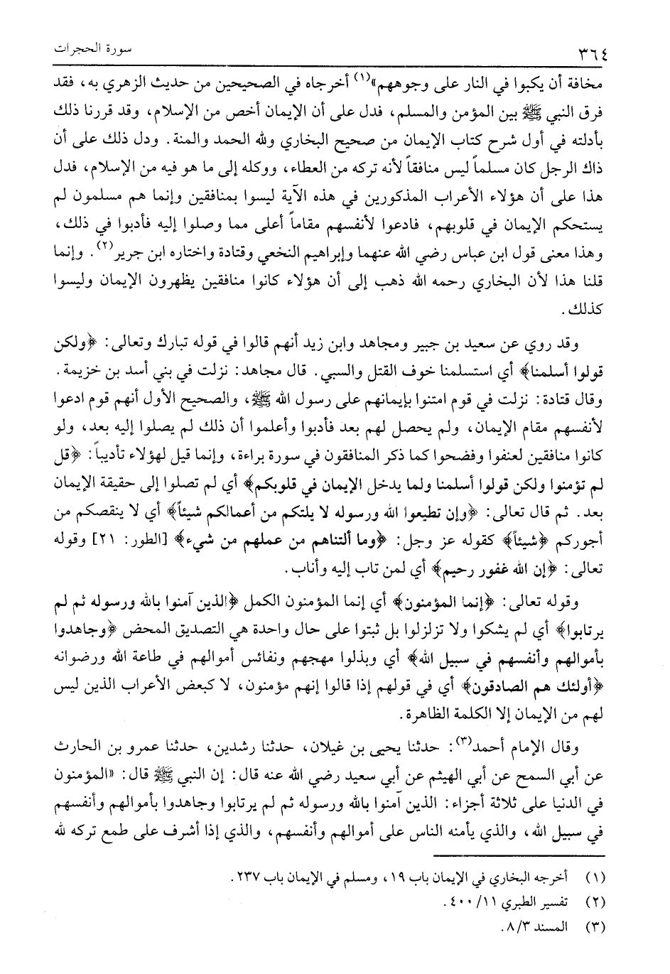 وقوله تعالى: إِنَّمَا الْمُؤْمِنُونَ أَيْ إِنَّمَا الْمُؤْمِنُونَ الْكُمَّلُ الَّذِينَ آمَنُوا بِاللَّهِ وَرَسُولِهِ ثُمَّ لَمْ يَرْتابُوا أَيْ لَمْ يَشُكُّوا وَلَا تَزَلْزَلُوا بَلْ ثَبَتُوا عَلَى حال واحدة هي التَّصْدِيقُ الْمَحْضُ وَجاهَدُوا بِأَمْوالِهِمْ وَأَنْفُسِهِمْ فِي سَبِيلِ اللَّهِ أَيْ وَبَذَلُوا مُهَجَهُمْ وَنَفَائِسَ أَمْوَالِهِمْ فِي طَاعَةِ اللَّهِ وَرِضْوَانِهِ أُولئِكَ هُمُ الصَّادِقُونَ أَيْ فِي قَوْلِهِمْ إِذَا قَالُوا إِنَّهُمْ مُؤْمِنُونَ، لَا كبعض الأعراب الذين ليس لهم من الإيمان إِلَّا الْكَلِمَةَ الظَّاهِرَةَ.