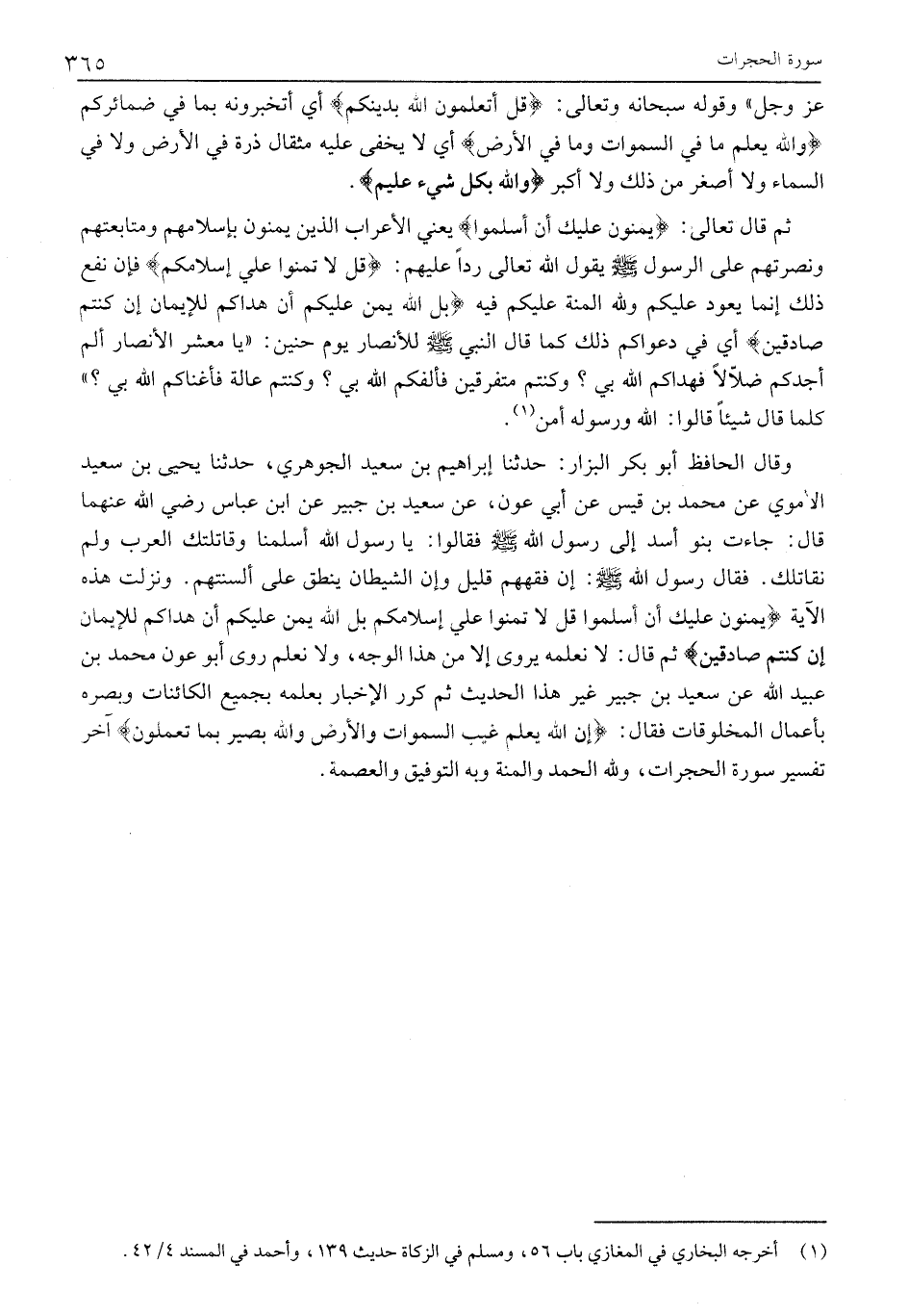 وَقَالَ الْحَافِظُ أَبُو بَكْرٍ الْبَزَّارُ: حَدَّثَنَا إِبْرَاهِيمُ بْنُ سَعِيدٍ الْجَوْهَرِيُّ، حَدَّثَنَا يَحْيَى بْنُ سَعِيدٍ الْأُمَوِيُّ عَنْ مُحَمَّدِ بْنِ قَيْسٍ عَنْ أَبِي عَوْنٍ، عَنْ سَعِيدِ بْنِ جُبَيْرٍ عَنِ ابْنِ عَبَّاسٍ رَضِيَ اللَّهُ عَنْهُمَا قَالَ: جَاءَتْ بَنُو أَسَدٍ إِلَى رَسُولِ اللَّهِ صَلَّى اللَّهُ عَلَيْهِ وَسَلَّمَ فَقَالُوا: يَا رَسُولَ الله أسلمنا وقاتلتك العرب ولم تقاتلك. فَقَالَ رَسُولُ اللَّهِ صَلَّى اللَّهُ عَلَيْهِ وَسَلَّمَ: إِنَّ فِقْهَهُمْ قَلِيلٌ وَإِنَّ الشَّيْطَانَ يَنْطِقُ عَلَى أَلْسِنَتِهِمْ. وَنَزَلَتْ هَذِهِ الْآيَةُ يَمُنُّونَ عَلَيْكَ أَنْ أَسْلَمُوا قُلْ لَا تَمُنُّوا عَلَيَّ إِسْلامَكُمْ بَلِ اللَّهُ يَمُنُّ عَلَيْكُمْ أَنْ هَداكُمْ لِلْإِيمانِ إِنْ كُنْتُمْ صادِقِينَ ثُمَّ قَالَ: لَا نَعْلَمُهُ يُرْوَى إِلَّا مِنْ هَذَا الْوَجْهِ، وَلَا نَعْلَمُ رَوَى أَبُو عَوْنٍ مُحَمَّدُ بْنُ عُبَيْدِ اللَّهِ عَنْ سَعِيدِ بْنِ جُبَيْرٍ غَيْرَ هَذَا الْحَدِيثِ ثُمَّ كَرَّرَ الْإِخْبَارَ بِعِلْمِهِ بِجَمِيعِ الْكَائِنَاتِ وَبَصَرِهِ بِأَعْمَالِ الْمَخْلُوقَاتِ فَقَالَ: إِنَّ اللَّهَ يَعْلَمُ غَيْبَ السَّماواتِ وَالْأَرْضِ وَاللَّهُ بَصِيرٌ بِما تَعْمَلُونَ آخِرُ تَفْسِيرِ سورة الحجرات، ولله الحمد والمنة وبه التوفيق والعصمة.