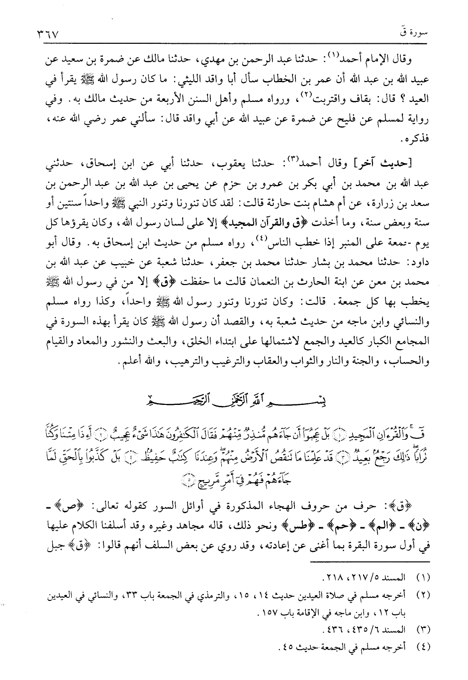 [حَدِيثٌ آخَرُ] وَقَالَ أَحْمَدُ «3» : حَدَّثَنَا يَعْقُوبُ، حَدَّثَنَا أَبِي عَنِ ابْنِ إِسْحَاقَ، حَدَّثَنِي عَبْدَ اللَّهِ بْنَ مُحَمَّدِ بْنِ أَبِي بَكْرٍ بْنِ عَمْرِو بْنِ حَزْمٍ عَنْ يَحْيَى بْنِ عَبْدِ اللَّهِ بْنُ عَبْدِ الرَّحْمَنِ بْنِ سَعْدِ بْنِ زُرَارَةَ، عَنْ أُمِّ هِشَامٍ بِنْتِ حَارِثَةَ قَالَتْ: لَقَدْ كَانَ تَنُّورُنَا وَتَنُّورُ النَّبِيِّ صَلَّى اللَّهُ عَلَيْهِ وَسَلَّمَ وَاحِدًا سَنَتَيْنِ أَوْ سَنَةً وَبَعْضَ سَنَةٍ، وَمَا أَخَذْتُ ق وَالْقُرْآنِ الْمَجِيدِ إِلَّا على لسان رسول الله، وكان يَقْرَؤُهَا كُلَّ يَوْمِ جُمُعَةٍ عَلَى الْمِنْبَرِ إِذَا خطب الناس «4» ، رواه مسلم مِنْ حَدِيثِ ابْنِ إِسْحَاقَ بِهِ. وَقَالَ أَبُو دَاوُدَ: حَدَّثَنَا مُحَمَّدُ بْنُ بَشَّارٍ حَدَّثَنَا مُحَمَّدُ بْنُ جَعْفَرٍ، حَدَّثَنَا شُعْبَةُ عَنْ خُبَيْبٍ عَنْ عَبْدِ اللَّهِ بْنِ مُحَمَّدِ بْنِ مَعْنٍ عَنِ ابْنَةِ الْحَارِثِ بْنِ النُّعْمَانِ قَالَتْ مَا حَفِظْتُ ق إِلَّا مِنْ فِي رَسُولِ اللَّهِ صَلَّى اللَّهُ عَلَيْهِ وَسَلَّمَ يَخْطُبُ بِهَا كُلَّ جُمُعَةٍ. قَالَتْ: وَكَانَ تَنُّورُنَا وَتَنُّورُ رَسُولِ اللَّهِ صَلَّى اللَّهُ عَلَيْهِ وَسَلَّمَ وَاحِدًا، وَكَذَا رَوَاهُ مُسْلِمٌ وَالنَّسَائِيُّ وَابْنُ مَاجَهْ مِنْ حَدِيثِ شُعْبَةَ بِهِ، وَالْقَصْدُ أَنَّ رَسُولَ اللَّهِ صَلَّى اللَّهُ عَلَيْهِ وَسَلَّمَ كَانَ يَقْرَأُ بِهَذِهِ السُّورَةِ فِي الْمَجَامِعِ الْكِبَارِ كَالْعِيدِ وَالْجُمَعِ لِاشْتِمَالِهَا عَلَى ابْتِدَاءِ الْخَلْقِ، وَالْبَعْثِ وَالنُّشُورِ وَالْمَعَادِ وَالْقِيَامِ وَالْحِسَابِ، وَالْجَنَّةِ وَالنَّارِ والثواب والعقاب والترغيب والترهيب، وَاللَّهُ أَعْلَمُ.