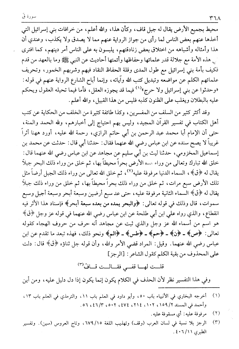 مُحِيطٌ بِجَمِيعِ الْأَرْضِ يُقَالُ لَهُ جَبَلُ قَافٍ، وَكَأَنَّ هَذَا، وَاللَّهُ أَعْلَمُ، مِنْ خُرَافَاتِ بَنِي إِسْرَائِيلَ الَّتِي أَخَذَهَا عَنْهُمْ بَعْضُ النَّاسِ لَمَّا رأى من جواز الرواية عنهم مما لَا يُصَدَّقُ وَلَا يُكَذَّبُ، وَعِنْدِي أَنَّ هَذَا وَأَمْثَالَهُ وَأَشْبَاهَهُ مِنَ اخْتِلَاقِ بَعْضِ زَنَادِقَتِهِمْ، يُلَبِّسُونَ بِهِ عَلَى النَّاسِ أَمْرَ دِينِهِمْ، كَمَا افْتُرِيَ فِي هَذِهِ الْأُمَّةِ مَعَ جَلَالَةِ قَدْرِ عُلَمَائِهَا وَحُفَّاظِهَا وَأَئِمَّتِهَا أَحَادِيثُ عَنِ النَّبِيِّ صَلَّى اللَّهُ عَلَيْهِ وَسَلَّمَ وَمَا بِالْعَهْدِ مِنْ قِدَمٍ فَكَيْفَ بِأُمَّةِ بَنِي إِسْرَائِيلَ مَعَ طُولِ الْمَدَى وَقِلَّةِ الْحُفَّاظِ النُّقَّادِ فِيهِمْ وَشُرْبِهِمُ الْخُمُورَ، وَتَحْرِيفِ عُلَمَائِهِمُ الْكَلِمَ عَنْ مَوَاضِعِهِ وَتَبْدِيلِ كُتُبِ اللَّهِ وَآيَاتِهِ، وَإِنَّمَا أَبَاحَ الشَّارِعُ الرِّوَايَةَ عَنْهُمْ فِي قَوْلِهِ: