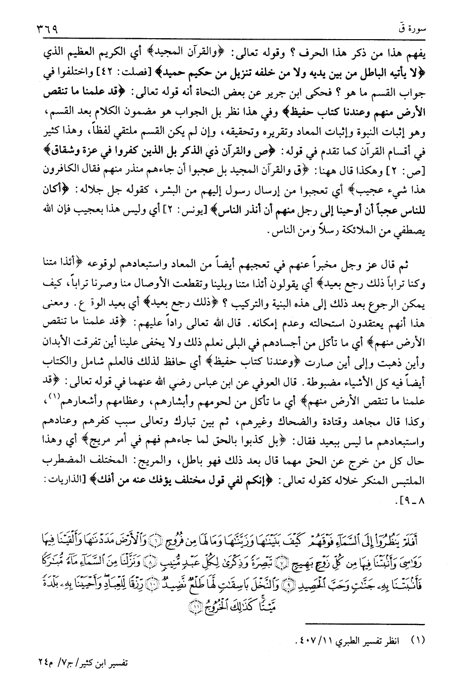 أَفَلَمْ يَنْظُرُوا إِلَى السَّماءِ فَوْقَهُمْ كَيْفَ بَنَيْناها وَزَيَّنَّاها وَما لَها مِنْ فُرُوجٍ (6) وَالْأَرْضَ مَدَدْناها وَأَلْقَيْنا فِيها رَواسِيَ وَأَنْبَتْنا فِيها مِنْ كُلِّ زَوْجٍ بَهِيجٍ (7) تَبْصِرَةً وَذِكْرى لِكُلِّ عَبْدٍ مُنِيبٍ (8) وَنَزَّلْنا مِنَ السَّماءِ مَاءً مُبارَكاً فَأَنْبَتْنا بِهِ جَنَّاتٍ وَحَبَّ الْحَصِيدِ (9) وَالنَّخْلَ باسِقاتٍ لَها طَلْعٌ نَضِيدٌ (10)