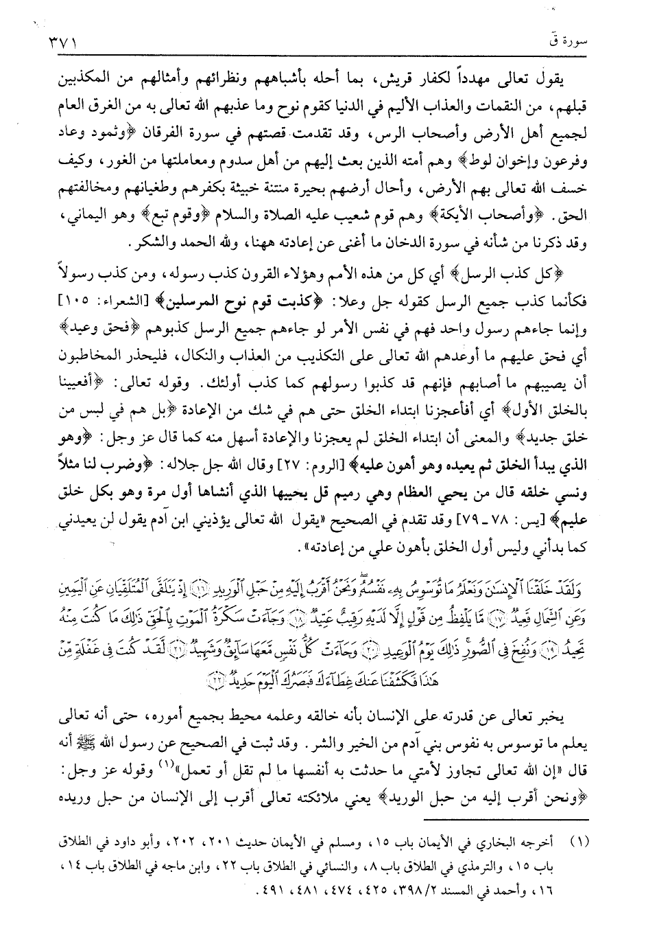 وَلَقَدْ خَلَقْنَا الْإِنْسانَ وَنَعْلَمُ مَا تُوَسْوِسُ بِهِ نَفْسُهُ وَنَحْنُ أَقْرَبُ إِلَيْهِ مِنْ حَبْلِ الْوَرِيدِ (16) إِذْ يَتَلَقَّى الْمُتَلَقِّيانِ عَنِ الْيَمِينِ وَعَنِ الشِّمالِ قَعِيدٌ (17) مَا يَلْفِظُ مِنْ قَوْلٍ إِلاَّ لَدَيْهِ رَقِيبٌ عَتِيدٌ (18) وَجاءَتْ سَكْرَةُ الْمَوْتِ بِالْحَقِّ ذلِكَ مَا كُنْتَ مِنْهُ تَحِيدُ (19) وَنُفِخَ فِي الصُّورِ ذلِكَ يَوْمُ الْوَعِيدِ (20)