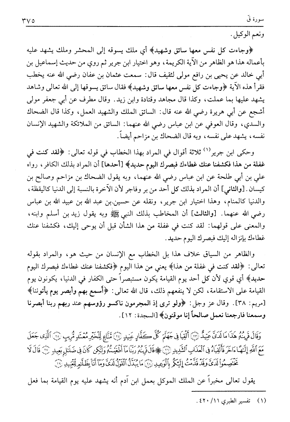 وَجاءَتْ كُلُّ نَفْسٍ مَعَها سائِقٌ وَشَهِيدٌ أَيْ مَلَكٌ يَسُوقُهُ إِلَى الْمَحْشَرِ وَمَلَكٌ يَشْهَدُ عَلَيْهِ بِأَعْمَالِهِ هَذَا هُوَ الظَّاهِرُ مِنَ الْآيَةِ الْكَرِيمَةِ، وَهُوَ اخْتِيَارُ ابْنِ جَرِيرٍ ثُمَّ رُوِيَ مِنْ حَدِيثِ إِسْمَاعِيلَ بْنِ أَبِي خَالِدٍ عَنِ يَحْيَى بْنِ رَافِعٍ مَوْلًى لِثَقِيفٍ قال: سمعت عثمان بن عفان رضي الله عنه يَخْطُبُ فَقَرَأَ هَذِهِ الْآيَةَ وَجاءَتْ كُلُّ نَفْسٍ مَعَها سائِقٌ وَشَهِيدٌ فَقَالَ سَائِقٌ يَسُوقُهَا إِلَى الله تعالى وَشَاهِدٌ يَشْهَدُ عَلَيْهَا بِمَا عَمِلَتْ، وَكَذَا قَالَ مُجَاهِدٌ وقَتَادَةُ وَابْنُ زَيْدٍ. وَقَالَ مُطَرِّفٌ عَنْ أَبِي جَعْفَرٍ مَوْلَى أَشْجَعَ عَنْ أَبِي هُرَيْرَةَ رَضِيَ اللَّهُ عَنْهُ قَالَ: السَّائِقُ الْمَلَكُ وَالشَّهِيدُ الْعَمَلُ، وَكَذَا قَالَ الضَّحَّاكُ والسدي، وَقَالَ الْعَوْفِيُّ عَنِ ابْنِ عَبَّاسٍ رَضِيَ اللَّهُ عنهما: السَّائِقُ مِنَ الْمَلَائِكَةِ وَالشَّهِيدُ الْإِنْسَانُ نَفْسُهُ، يَشْهَدُ عَلَى نَفْسِهِ، وَبِهِ قَالَ الضَّحَّاكُ بْنُ مُزَاحِمٍ أَيْضًا.