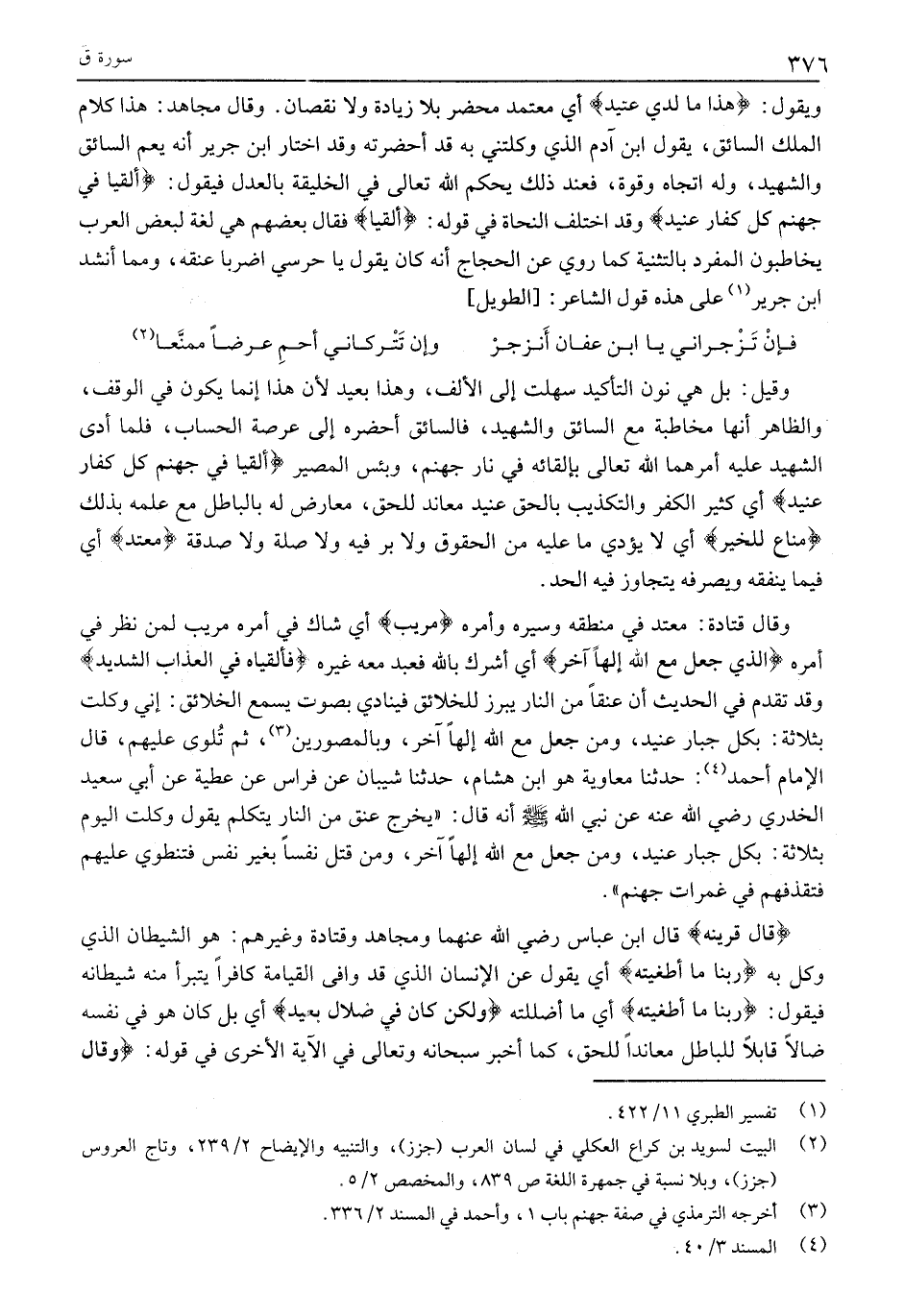 وَقِيلَ: بَلْ هِيَ نُونُ التَّأْكِيدِ سُهِّلَتْ إِلَى الْأَلْفِ، وَهَذَا بَعِيدٌ لِأَنَّ هَذَا إِنَّمَا يَكُونُ فِي الْوَقْفِ، وَالظَّاهِرُ أَنَّهَا مُخَاطَبَةٌ مَعَ السَّائِقِ وَالشَّهِيدِ، فَالسَّائِقُ أَحْضَرَهُ إِلَى عَرْصَةِ الْحِسَابِ، فَلَمَّا أَدَّى الشَّهِيدُ عَلَيْهِ أَمَرَهُمَا اللَّهُ تَعَالَى بِإِلْقَائِهِ فِي نَارِ جَهَنَّمَ، وَبِئْسَ الْمَصِيرُ أَلْقِيا فِي جَهَنَّمَ كُلَّ كَفَّارٍ عَنِيدٍ أَيْ كَثِيرُ الْكُفْرِ وَالتَّكْذِيبِ بِالْحَقِّ عَنِيدٌ مُعَانِدٌ لِلْحَقِّ، مُعَارِضٌ لَهُ بِالْبَاطِلِ مَعَ عِلْمِهِ بِذَلِكَ مَنَّاعٍ لِلْخَيْرِ أَيْ لَا يُؤَدِّي مَا عَلَيْهِ مِنَ الْحُقُوقِ وَلَا بِرَّ فِيهِ وَلَا صِلَةَ وَلَا صَدَقَةَ مُعْتَدٍ أَيْ فِيمَا يُنْفِقُهُ وَيَصْرِفُهُ يَتَجَاوَزُ فِيهِ الْحَدَّ.