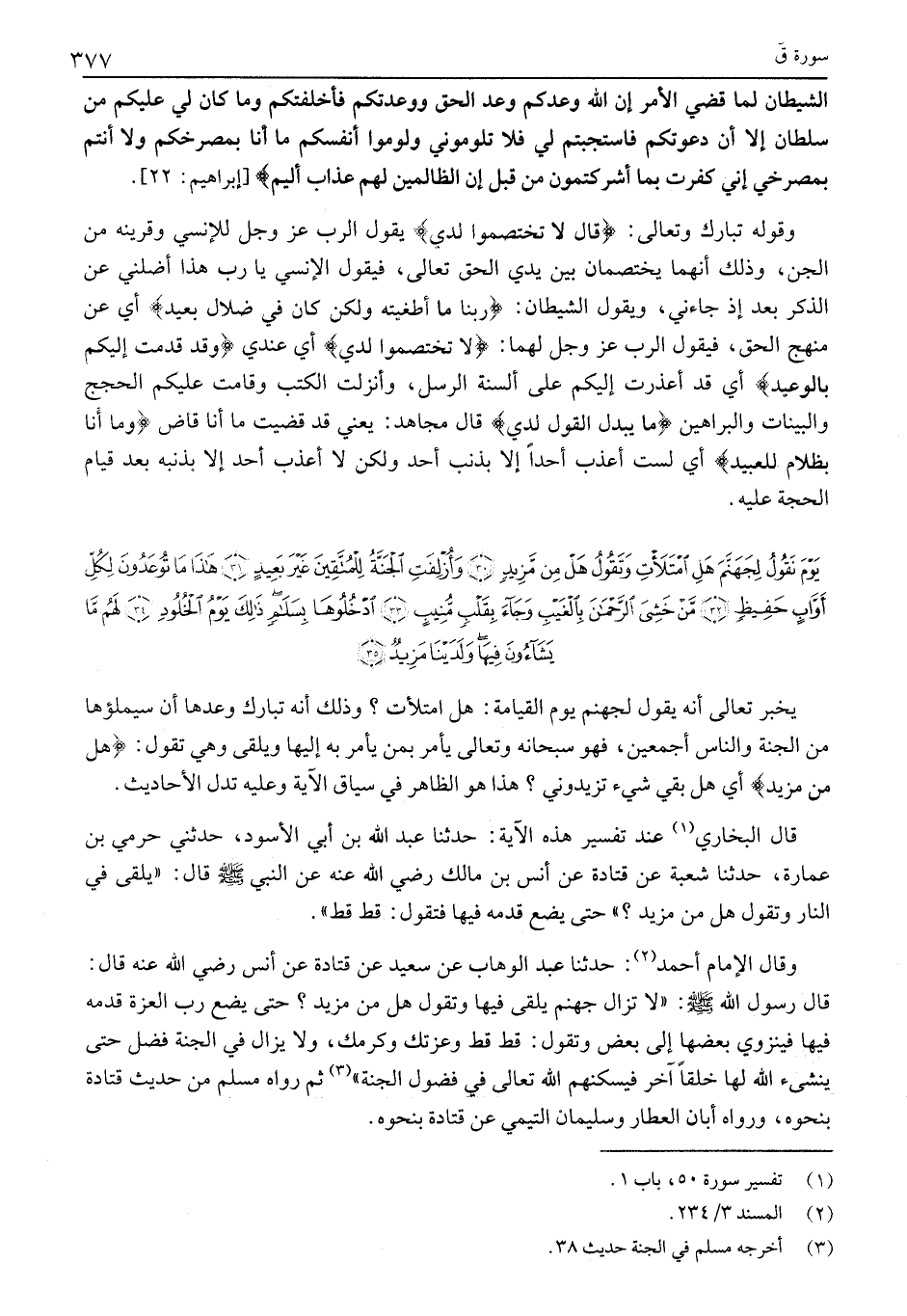 قَالَ الْبُخَارِيُّ «1» عِنْدَ تَفْسِيرِ هَذِهِ الْآيَةِ: حَدَّثَنَا عَبْدُ اللَّهِ بن أبي الأسود، حدثني حَرَمِيُّ بْنُ عُمَارَةَ، حَدَّثَنَا شُعْبَةَ عَنْ قَتَادَةَ عَنْ أَنَسِ بْنِ مَالِكٍ رَضِيَ اللَّهُ عَنْهُ عَنِ النَّبِيِّ صَلَّى اللَّهُ عَلَيْهِ وَسَلَّمَ قَالَ: «يُلْقَى فِي النَّارِ وَتَقُولُ هَلْ مِنْ مَزِيدٍ؟» حَتَّى يَضَعَ قَدَمَهُ فِيهَا فَتَقُولُ: قَطُّ قَطُّ» .
