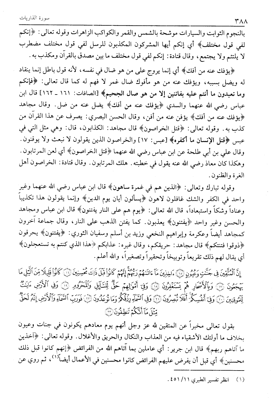 يُؤْفَكُ عَنْهُ مَنْ أُفِكَ أَيْ إِنَّمَا يُرَوَّجُ عَلَى مَنْ هُوَ ضَالٌّ فِي نَفْسِهِ، لِأَنَّهُ قَوْلٌ بَاطِلٌ إِنَّمَا يَنْقَادُ لَهُ وَيَضِلُّ بِسَبَبِهِ، وَيُؤْفَكُ عَنْهُ مَنْ هُوَ مَأْفُوكٌ ضَالٌّ غَمْرٌ لَا فَهْمَ لَهُ كَمَا قَالَ تَعَالَى: فَإِنَّكُمْ وَما تَعْبُدُونَ مَا أَنْتُمْ عَلَيْهِ بِفاتِنِينَ إِلَّا مَنْ هُوَ صالِ الْجَحِيمِ [الصَّافَّاتِ: 161- 162] قَالَ ابْنُ عَبَّاسٍ رضي الله عنهما وَالسُّدِّيُّ يُؤْفَكُ عَنْهُ مَنْ أُفِكَ يَضِلُّ عَنْهُ مَنْ ضَلَّ. وَقَالَ مُجَاهِدٌ يُؤْفَكُ عَنْهُ مَنْ أُفِكَ يُؤْفَنُ عَنْهُ مَنْ أُفِنَ، وَقَالَ الْحَسَنُ الْبَصْرِيُّ: يُصْرَفُ عَنْ هَذَا الْقُرْآنِ مَنْ كَذَّبَ به. وقوله تعالى: قُتِلَ الْخَرَّاصُونَ قَالَ مُجَاهِدٌ: الْكَذَّابُونَ، قَالَ: وَهِيَ مِثْلُ الَّتِي فِي عَبَسَ قُتِلَ الْإِنْسانُ مَا أَكْفَرَهُ [عَبَسَ: 17] وَالْخَرَّاصُونَ الَّذِينَ يَقُولُونَ لَا نُبْعَثُ وَلَا يُوقِنُونَ.