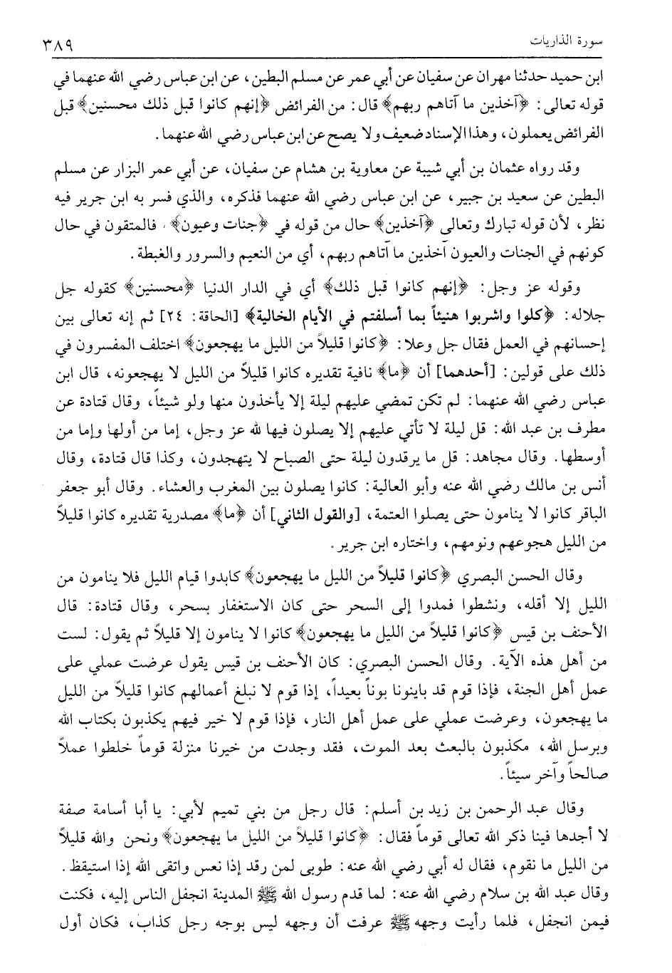 وَقَالَ الْحَسَنُ الْبَصْرِيُّ كانُوا قَلِيلًا مِنَ اللَّيْلِ مَا يَهْجَعُونَ كَابَدُوا قِيَامَ اللَّيْلِ فَلَا يَنَامُونَ مِنَ اللَّيْلِ إِلَّا أَقَلَّهُ، وَنَشِطُوا فَمَدُّوا إِلَى السَّحَرِ حَتَّى كَانَ الِاسْتِغْفَارُ بِسَحَرٍ، وَقَالَ قَتَادَةُ: قَالَ الْأَحْنَفُ بْنُ قَيْسٍ كانُوا قَلِيلًا مِنَ اللَّيْلِ مَا يَهْجَعُونَ كَانُوا لَا يَنَامُونَ إِلَّا قَلِيلًا ثُمَّ يَقُولُ: لَسْتُ مِنْ أَهْلِ هَذِهِ الْآيَةِ. وَقَالَ الْحَسَنُ الْبَصْرِيُّ: كَانَ الْأَحْنَفُ بْنُ قَيْسٍ يَقُولُ عَرَضْتُ عَمَلِي عَلَى عَمَلِ أَهْلِ الْجَنَّةِ، فَإِذَا قَوْمٌ قَدْ بَايَنُونَا بَوْنًا بَعِيدًا، إِذَا قَوْمٌ لَا نَبْلُغُ أَعْمَالَهُمْ كَانُوا قَلِيلًا مِنَ اللَّيْلِ مَا يَهْجَعُونَ، وَعَرَضْتُ عَمَلِي عَلَى عَمَلِ أَهْلِ النَّارِ، فَإِذَا قَوْمٌ لَا خَيْرَ فِيهِمْ يُكَذِّبُونَ بِكِتَابِ الله وبرسل الله، مكذبون بالبعث بعد الموت، فقد وجدت مِنْ خَيْرِنَا مَنْزِلَةً قَوْمًا خَلَطُوا عَمَلًا صَالِحًا وَآخَرَ سَيِّئًا.