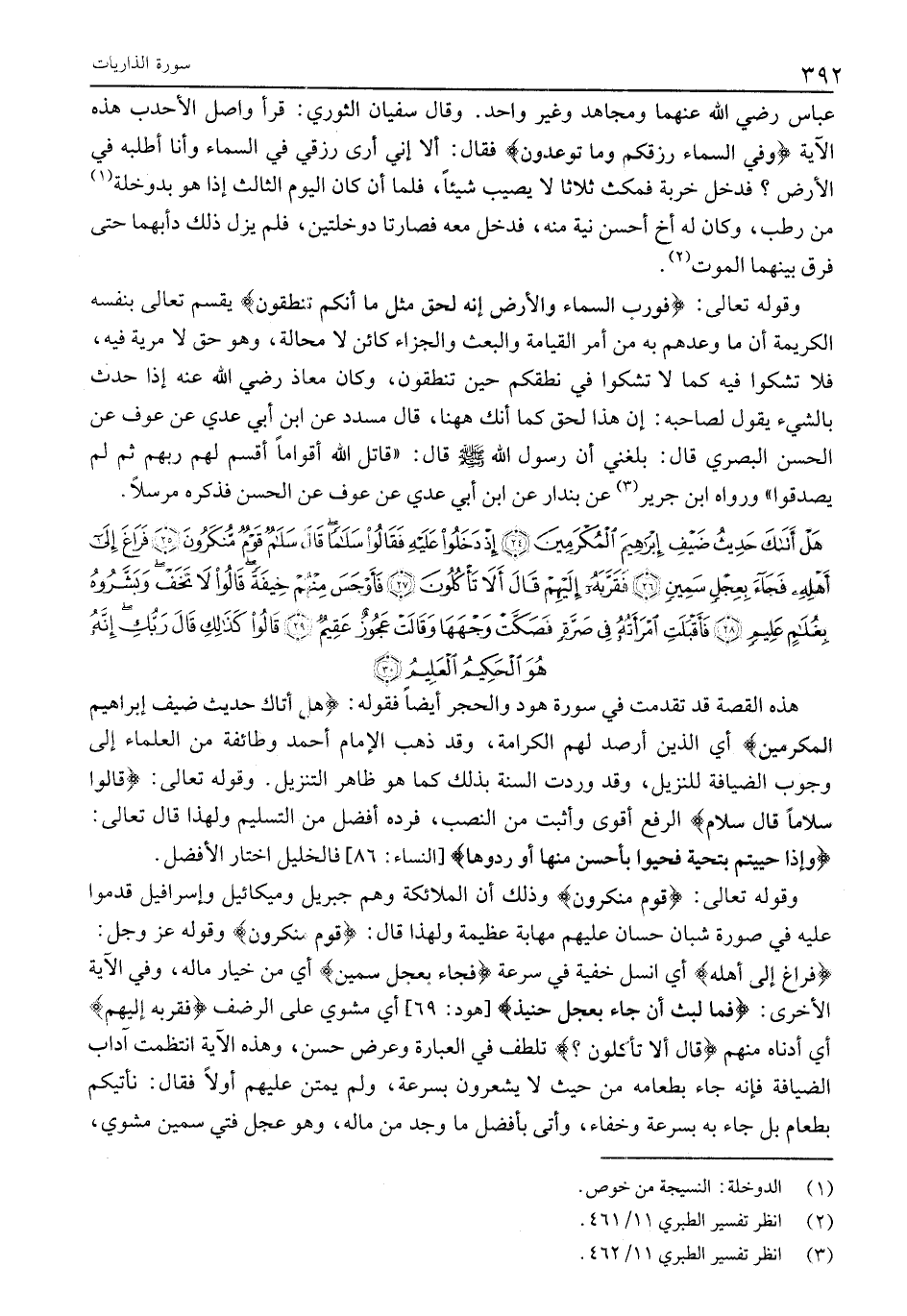 هَذِهِ الْقِصَّةُ قَدْ تَقَدَّمَتْ في سورة هود والحجر أيضا فقوله: هَلْ أَتاكَ حَدِيثُ ضَيْفِ إِبْراهِيمَ الْمُكْرَمِينَ أَيِ الَّذِينَ أَرْصَدَ لَهُمُ الْكَرَامَةَ، وَقَدْ ذَهَبَ الْإِمَامُ أَحْمَدُ وَطَائِفَةٌ مِنَ الْعُلَمَاءِ إِلَى وُجُوبِ الضِّيَافَةِ لِلنَّزِيلِ، وَقَدْ وَرَدَتِ السُّنَّةُ بِذَلِكَ كَمَا هُوَ ظاهر التنزيل. وقوله تعالى: فَقالُوا سَلاماً قالَ سَلامٌ الرَّفْعُ أَقْوَى وَأَثْبَتُ مِنَ النَّصْبِ، فَرَدُّهُ أَفْضَلُ مِنَ التَّسْلِيمِ وَلِهَذَا قَالَ تَعَالَى: