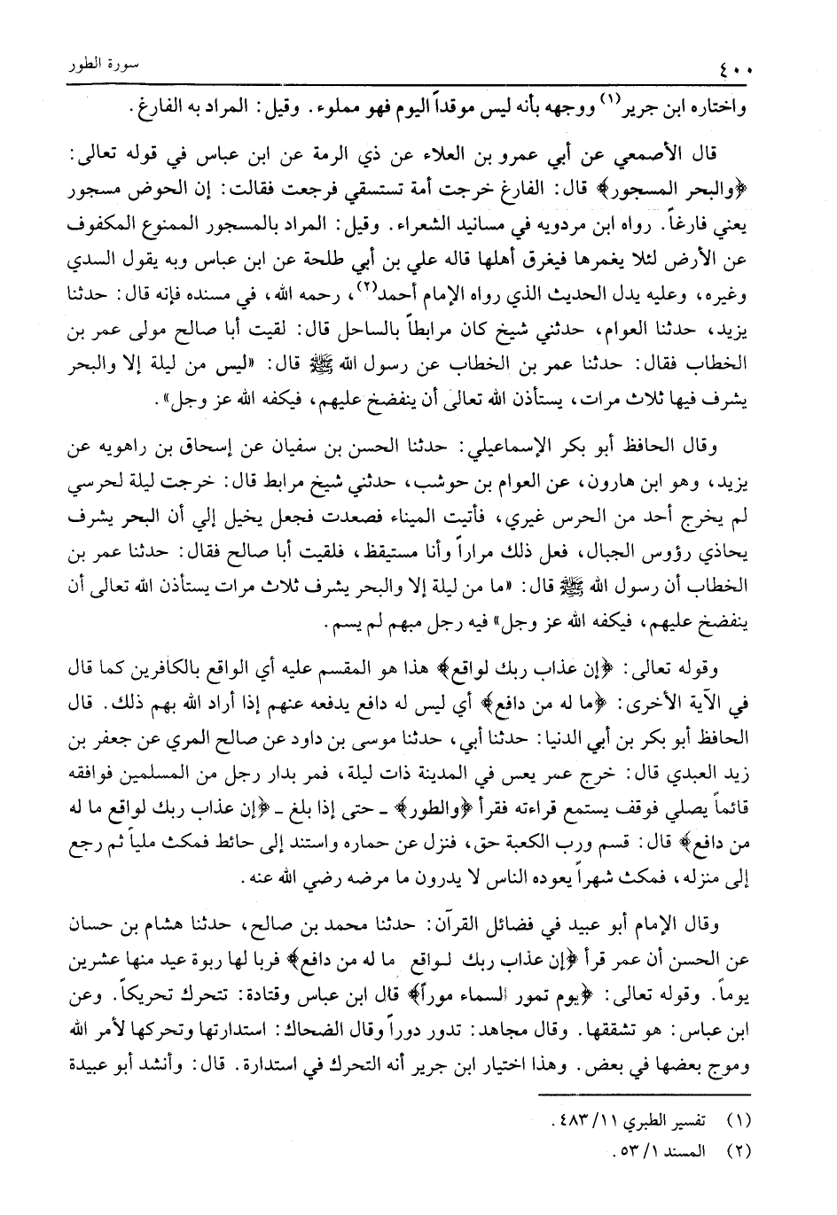 وَالْبَحْرِ الْمَسْجُورِ قَالَ: الْفَارِغُ خَرَجَتْ أُمَّةٌ تَسْتَسْقِي فرجعت فقالت: إن الحوض مسجور يعني فَارِغًا. رَوَاهُ ابْنُ مَرْدَوَيْهِ فِي مَسَانِيدِ الشُّعَرَاءِ. وَقِيلَ: الْمُرَادُ بِالْمَسْجُورِ الْمَمْنُوعُ الْمَكْفُوفُ عَنِ الْأَرْضِ لِئَلَّا يَغْمُرَهَا فَيُغْرِقَ أَهْلَهَا قَالَهُ عَلِيُّ بْنُ أَبِي طَلْحَةَ عَنِ ابْنِ عَبَّاسٍ وَبِهِ يَقُولُ السُّدِّيُّ وَغَيْرُهُ، وَعَلَيْهِ يَدُلُّ الْحَدِيثُ الَّذِي رَوَاهُ الْإِمَامُ أَحْمَدُ «2» ، رَحِمَهُ اللَّهُ، فِي مُسْنَدِهِ فَإِنَّهُ قَالَ: حَدَّثَنَا يَزِيدُ، حَدَّثَنَا الْعَوَّامُ، حَدَّثَنِي شَيْخٌ كَانَ مُرَابِطًا بِالسَّاحِلِ قَالَ: لَقِيتُ أَبَا صَالِحٍ مَوْلَى عُمَرَ بْنِ الْخَطَّابِ فَقَالَ: حَدَّثَنَا عُمَرَ بْنِ الْخَطَّابِ عَنْ رَسُولِ اللَّهِ صَلَّى اللَّهُ عَلَيْهِ وَسَلَّمَ قَالَ: «لَيْسَ مِنْ لَيْلَةٍ إِلَّا وَالْبَحْرُ يُشْرِفُ فِيهَا ثَلَاثَ مَرَّاتٍ، يَسْتَأْذِنُ اللَّهَ تعالى أَنْ يَنْفَضِخَ عَلَيْهِمْ، فَيَكُفُّهُ اللَّهُ عَزَّ وَجَلَّ» .