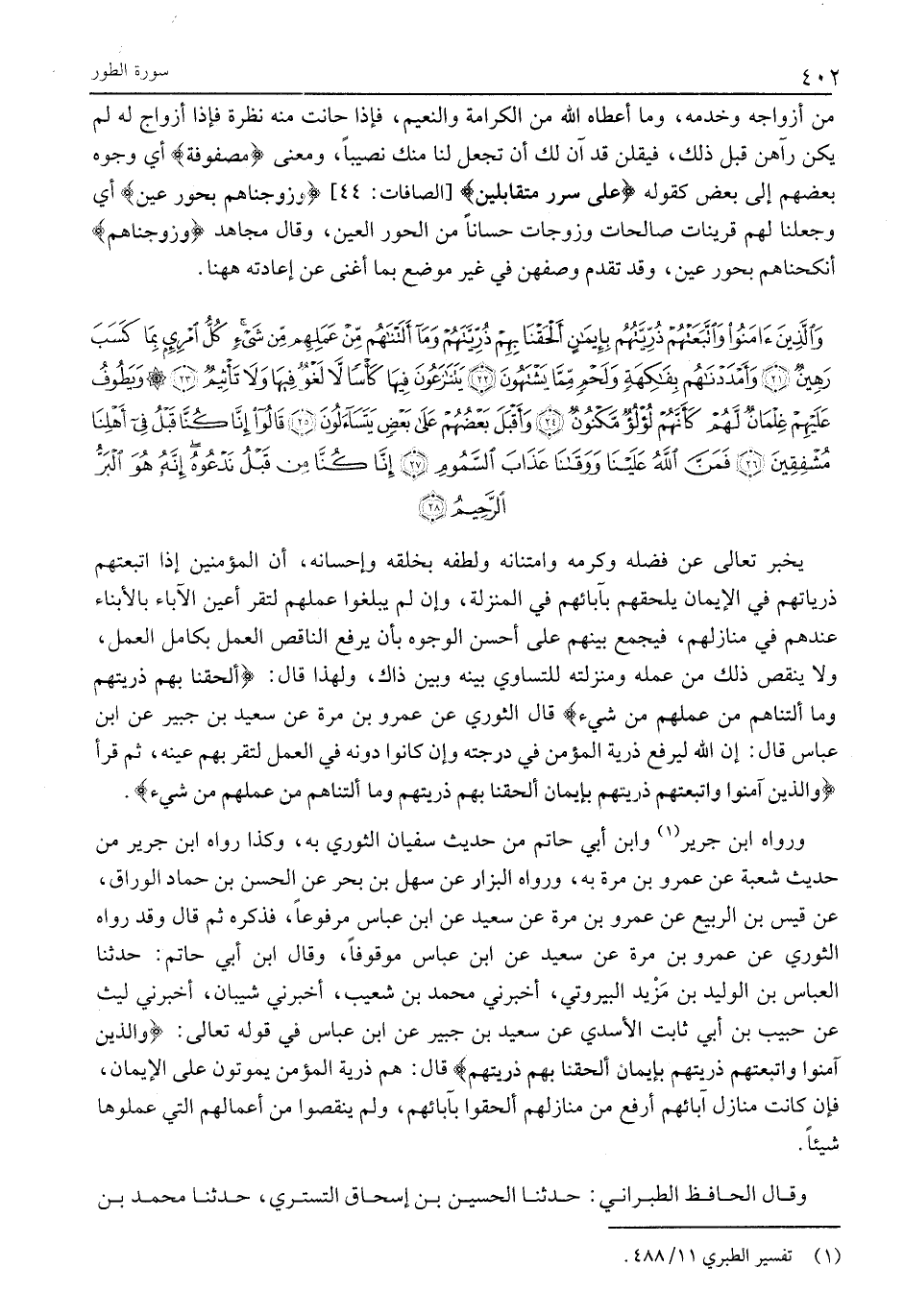 يُخْبِرُ تَعَالَى عَنْ فَضْلِهِ وَكَرَمِهِ وَامْتِنَانِهِ وَلُطْفِهِ بِخَلْقِهِ وَإِحْسَانِهِ، أَنَّ الْمُؤْمِنِينَ إِذَا اتَّبَعَتْهُمْ ذُرِّيَّاتُهُمْ فِي الْإِيمَانِ يُلْحِقُهُمْ بِآبَائِهِمْ فِي الْمَنْزِلَةِ، وَإِنْ لَمْ يَبْلُغُوا عَمَلَهُمْ لِتَقَرَّ أَعْيُنُ الْآبَاءِ بِالْأَبْنَاءِ عِنْدَهُمْ فِي مَنَازِلِهِمْ، فَيَجْمَعُ بَيْنَهُمْ عَلَى أَحْسَنِ الْوُجُوهِ بِأَنْ يَرْفَعَ النَّاقِصَ الْعَمَلِ بِكَامِلِ الْعَمَلِ، وَلَا يَنْقُصَ ذَلِكَ مِنْ عَمَلِهِ وَمَنْزِلَتِهِ لِلتَّسَاوِي بَيْنَهُ وَبَيْنَ ذَاكَ، وَلِهَذَا قَالَ: أَلْحَقْنا بِهِمْ ذُرِّيَّتَهُمْ وَما أَلَتْناهُمْ مِنْ عَمَلِهِمْ مِنْ شَيْءٍ قَالَ الثَّوْرِيُّ عَنْ عَمْرِو بْنِ مُرَّةَ عَنْ سَعِيدِ بْنِ جبير عن ابْنِ عَبَّاسٍ قَالَ: إِنَّ اللَّهَ لَيَرْفَعُ ذُرِّيَّةَ الْمُؤْمِنِ فِي دَرَجَتِهِ وَإِنْ كَانُوا دُونَهُ فِي الْعَمَلِ لِتَقَرَّ بِهِمْ عَيْنُهُ، ثُمَّ قَرَأَ وَالَّذِينَ آمَنُوا وَاتَّبَعَتْهُمْ ذُرِّيَّتُهُمْ بِإِيمانٍ أَلْحَقْنا بِهِمْ ذُرِّيَّتَهُمْ وَما أَلَتْناهُمْ مِنْ عَمَلِهِمْ مِنْ شَيْءٍ.