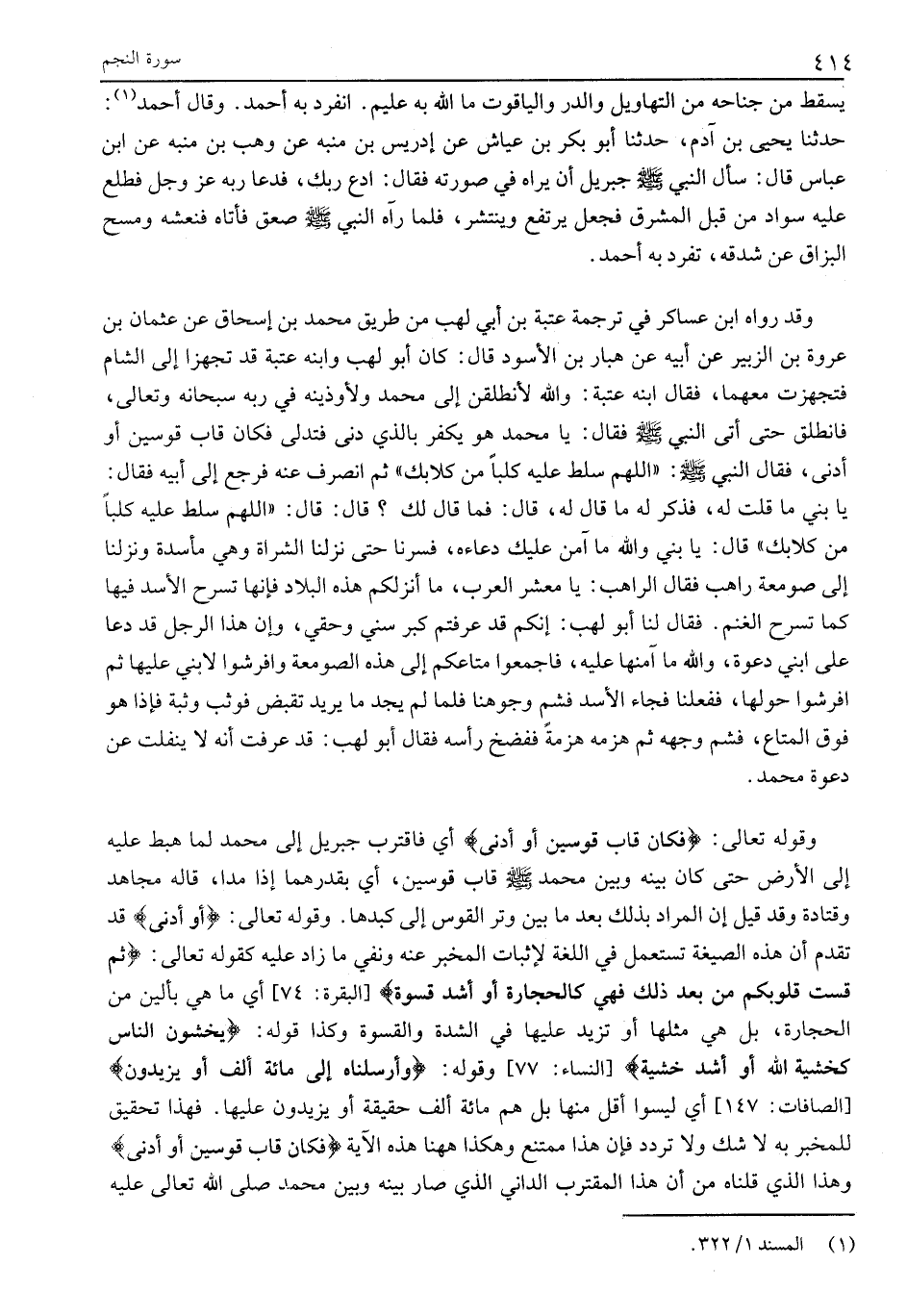 وقوله تعالى: فَكانَ قابَ قَوْسَيْنِ أَوْ أَدْنى أَيْ فَاقْتَرَبَ جِبْرِيلُ إِلَى مُحَمَّدٍ لَمَّا هَبَطَ عَلَيْهِ إِلَى الْأَرْضِ حَتَّى كَانَ بَيْنَهُ وَبَيْنَ مُحَمَّدٍ صَلَّى اللَّهُ عَلَيْهِ وَسَلَّمَ قَابُ قَوْسَيْنِ، أَيْ بِقَدْرِهِمَا إِذَا مُدَّا، قَالَهُ مُجَاهِدٌ وقَتَادَةُ وَقَدْ قِيلَ إِنَّ الْمُرَادَ بِذَلِكَ بُعْدُ مَا بَيْنَ وَتَرِ القوس إلى كبدها. وقوله تعالى: أَوْ أَدْنى قَدْ تَقَدَّمَ أَنَّ هَذِهِ الصِّيغَةَ تُسْتَعْمَلُ فِي اللُّغَةِ لِإِثْبَاتِ الْمُخْبَرِ عَنْهُ وَنَفْيِ ما زاد عليه كقوله تَعَالَى: ثُمَّ قَسَتْ قُلُوبُكُمْ مِنْ بَعْدِ ذلِكَ فَهِيَ كَالْحِجارَةِ أَوْ أَشَدُّ قَسْوَةً [الْبَقَرَةِ: 74] أَيْ مَا هِيَ بِأَلْيَنَ مِنَ الْحِجَارَةِ، بَلْ هِيَ مِثْلُهَا أَوْ تَزِيدُ عَلَيْهَا فِي الشِّدَّةِ وَالْقَسْوَةِ وَكَذَا قَوْلُهُ: يَخْشَوْنَ النَّاسَ كَخَشْيَةِ اللَّهِ أَوْ أَشَدَّ خَشْيَةً [النِّسَاءِ: 77] وَقَوْلُهُ: وَأَرْسَلْناهُ إِلى مِائَةِ أَلْفٍ أَوْ يَزِيدُونَ [الصَّافَّاتِ: 147] أَيْ لَيْسُوا أَقَلَّ مِنْهَا بَلْ هُمْ مِائَةُ أَلْفٍ حَقِيقَةً أَوْ يَزِيدُونَ عَلَيْهَا. فَهَذَا تَحْقِيقٌ لِلْمُخْبَرِ بِهِ لَا شك ولا تردد فإن هذا ممتنع وهكذا هاهنا هذه الآية فَكانَ قابَ قَوْسَيْنِ أَوْ أَدْنى وَهَذَا الَّذِي قُلْنَاهُ مِنْ أَنَّ هَذَا الْمُقْتَرِبَ الدَّانِيَ الَّذِي صَارَ بَيْنَهُ وَبَيْنَ مُحَمَّدٍ صَلَّى الله تعالى عليه