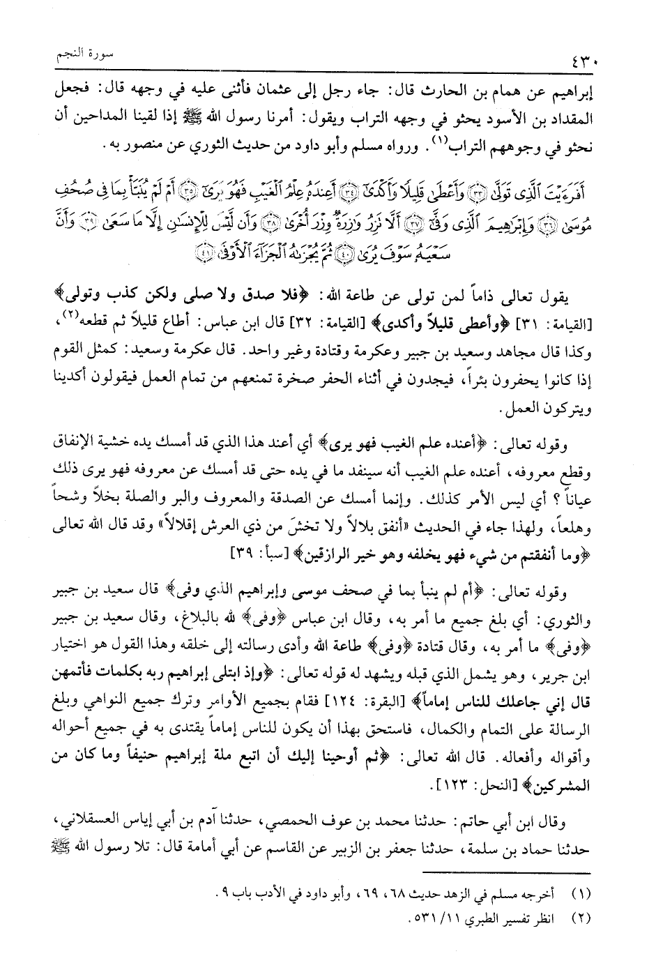 أَفَرَأَيْتَ الَّذِي تَوَلَّى (33) وَأَعْطى قَلِيلاً وَأَكْدى (34) أَعِنْدَهُ عِلْمُ الْغَيْبِ فَهُوَ يَرى (35) أَمْ لَمْ يُنَبَّأْ بِما فِي صُحُفِ مُوسى (36) وَإِبْراهِيمَ الَّذِي وَفَّى (37)