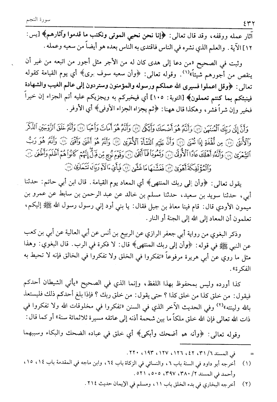 وَأَنَّ إِلى رَبِّكَ الْمُنْتَهى (42) وَأَنَّهُ هُوَ أَضْحَكَ وَأَبْكى (43) وَأَنَّهُ هُوَ أَماتَ وَأَحْيا (44) وَأَنَّهُ خَلَقَ الزَّوْجَيْنِ الذَّكَرَ وَالْأُنْثى (45) مِنْ نُطْفَةٍ إِذا تُمْنى (46)