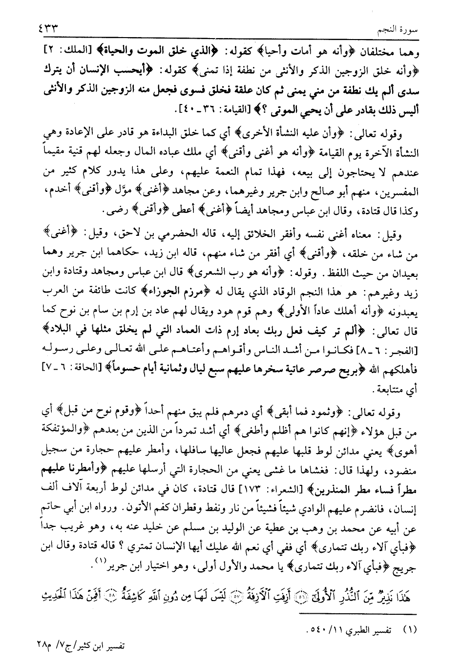 وقوله تعالى: وَثَمُودَ فَما أَبْقى أَيْ دَمَّرَهُمْ فَلَمْ يُبْقِ مِنْهُمْ أَحَدًا وَقَوْمَ نُوحٍ مِنْ قَبْلُ أَيْ مِنْ قَبْلِ هَؤُلَاءِ إِنَّهُمْ كانُوا هُمْ أَظْلَمَ وَأَطْغى أَيْ أَشَدُّ تَمَرُّدًا مِنَ الَّذِينَ مِنْ بَعْدِهِمْ وَالْمُؤْتَفِكَةَ أَهْوى يَعْنِي مَدَائِنَ لُوطٍ قَلَبَهَا عَلَيْهِمْ فَجَعَلَ عَالِيَهَا سَافِلَهَا، وَأَمْطَرَ عَلَيْهِمْ حِجَارَةً مِنْ سِجِّيلٍ مَنْضُودٍ، وَلِهَذَا قَالَ: فَغَشَّاهَا مَا غَشَّى يَعْنِي مِنَ الْحِجَارَةِ الَّتِي أَرْسَلَهَا عَلَيْهِمْ وَأَمْطَرْنا عَلَيْهِمْ مَطَراً فَساءَ مَطَرُ الْمُنْذَرِينَ [الشُّعَرَاءِ: 173] قَالَ قَتَادَةُ، كَانَ فِي مَدَائِنِ لُوطٍ أَرْبَعَةُ آلَافِ أَلْفِ إِنْسَانٍ، فَانْضَرَمَ عَلَيْهِمُ الْوَادِي شَيْئًا فشيئا من نار ونفط وقطران كفم الأتون. وَرَوَاهُ ابْنُ أَبِي حَاتِمٍ عَنْ أَبِيهِ عَنْ مُحَمَّدِ بْنِ وَهْبِ بْنِ عَطِيَّةَ عَنِ الْوَلِيدِ بْنِ مُسْلِمٍ عَنْ خُلَيْدٍ عَنْهُ بِهِ، وَهُوَ غَرِيبٌ جِدًّا فَبِأَيِّ آلاءِ رَبِّكَ تَتَمارى أَيْ فَفِي أَيِّ نِعَمِ اللَّهِ عَلَيْكَ أَيُّهَا الْإِنْسَانُ تَمْتَرِي؟ قَالَهُ قَتَادَةُ وَقَالَ ابْنُ جُرَيْجٍ فَبِأَيِّ آلاءِ رَبِّكَ تَتَمارى يَا مُحَمَّدُ وَالْأَوَّلُ أَوْلَى، وهو اختيار ابن جرير «1» .
