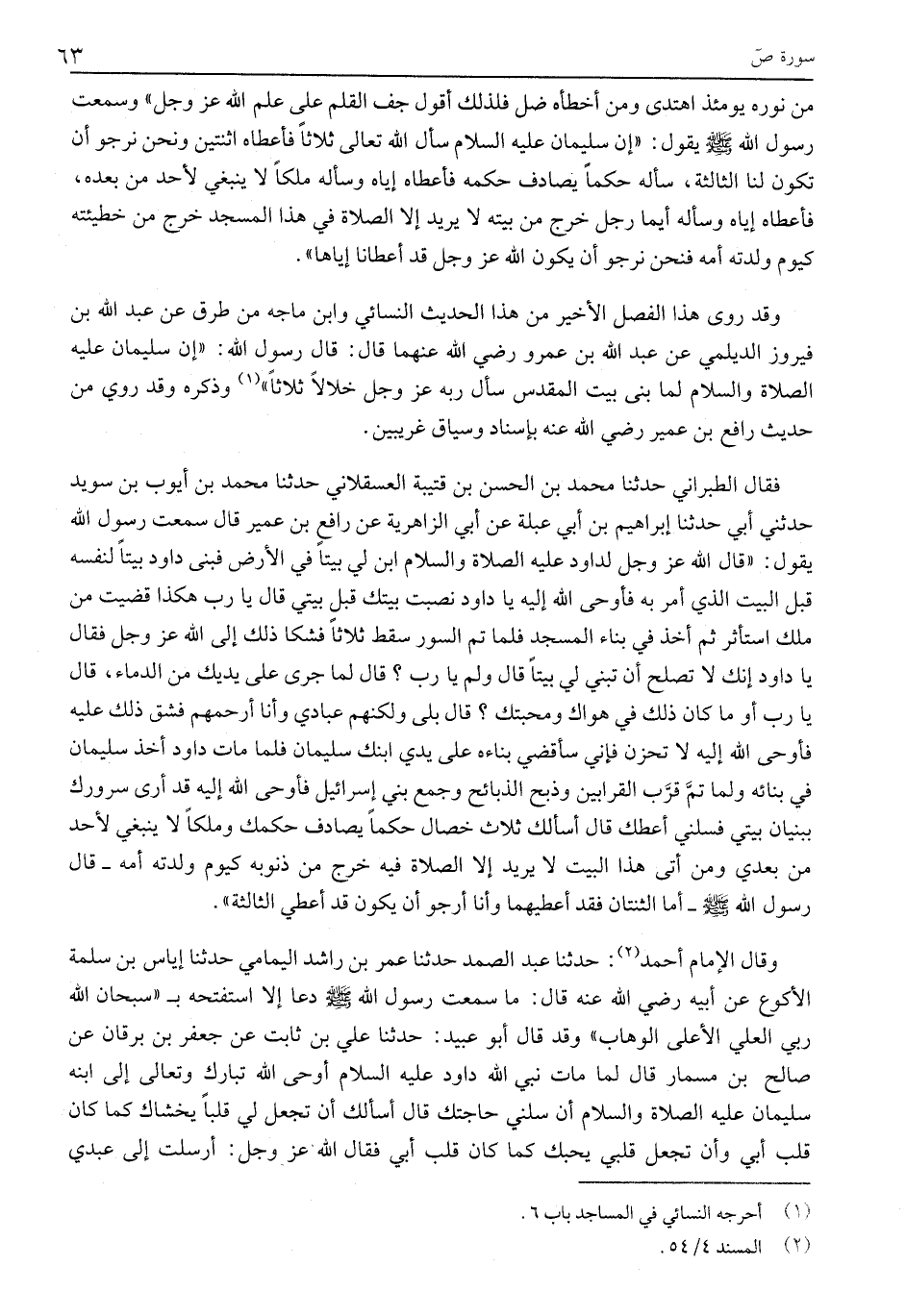 وَقَدْ رَوَى هَذَا الْفَصْلَ الْأَخِيرَ مِنْ هَذَا الْحَدِيثِ النَّسَائِيُّ وَابْنُ مَاجَهْ مِنْ طُرُقٍ عَنْ عَبْدِ اللَّهِ بْنِ فَيْرُوزَ الديلمي عَنْ عَبْدِ اللَّهِ بْنِ عَمْرٍو رَضِيَ اللَّهُ عنهما قال: قال رسول الله: «إن سليمان عليه الصلاة والسلام لَمَّا بَنَى بَيْتَ الْمَقْدِسِ سَأَلَ رَبَّهُ عَزَّ وَجَلَّ خِلَالًا ثَلَاثًا» «1» وَذَكَرَهُ وَقَدْ رُوِيَ مِنْ حَدِيثِ رَافِعِ بْنِ عُمَيْرٍ رَضِيَ اللَّهُ عَنْهُ بِإِسْنَادٍ وَسِيَاقٍ غَرِيبَيْنِ.