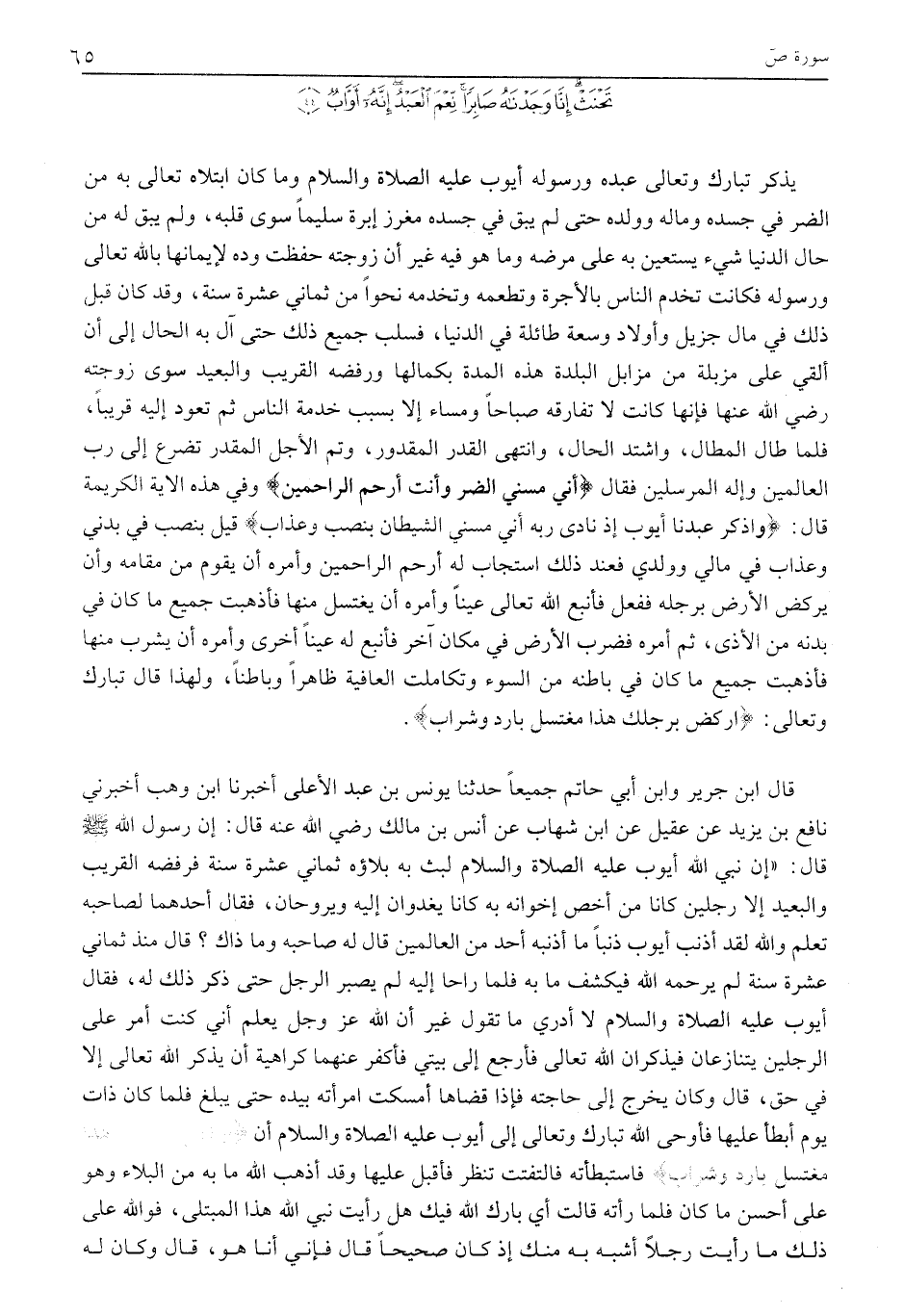 قَالَ ابْنُ جَرِيرٍ وَابْنُ أَبِي حَاتِمٍ جَمِيعًا حَدَّثَنَا يُونُسُ بْنُ عَبْدِ الْأَعْلَى أَخْبَرَنَا ابْنُ وَهْبٍ أَخْبَرَنِي نَافِعُ بْنُ يَزِيدَ عَنْ عُقَيْلٍ عَنِ ابْنِ شِهَابٍ عَنْ أَنَسِ بْنِ مَالِكٍ رَضِيَ اللَّهُ عَنْهُ قَالَ: إِنَّ رَسُولَ اللَّهِ صَلَّى اللَّهُ عَلَيْهِ وَسَلَّمَ قَالَ: «إِنَّ نَبِيَّ اللَّهِ أيوب عليه الصلاة والسلام لَبِثَ بِهِ بَلَاؤُهُ ثَمَانِيَ عَشْرَةَ سَنَةً فَرَفَضَهُ الْقَرِيبُ وَالْبَعِيدُ إِلَّا رَجُلَيْنِ كَانَا مِنْ أَخَصِّ إِخْوَانِهِ بِهِ كَانَا يَغْدُوَانِ إِلَيْهِ وَيَرُوحَانِ، فَقَالَ أَحَدُهُمَا لِصَاحِبِهِ تَعَلَّمْ وَاللَّهِ لَقَدْ أَذْنَبَ أَيُّوبُ ذَنْبًا مَا أَذْنَبَهُ أَحَدٌ مِنَ الْعَالَمِينَ قَالَ لَهُ صَاحِبُهُ وَمَا ذَاكَ؟ قَالَ مُنْذُ ثَمَانِيَ عَشْرَةَ سَنَةً لَمْ يَرْحَمْهُ اللَّهُ فَيَكْشِفَ مَا بِهِ فَلَمَّا رَاحَا إِلَيْهِ لَمْ يَصْبِرِ الرَّجُلُ حَتَّى ذَكَرَ ذَلِكَ لَهُ، فَقَالَ أَيُّوبُ عَلَيْهِ الصلاة والسلام لَا أَدْرِي مَا تَقُولُ غَيْرَ أَنَّ اللَّهَ عَزَّ وَجَلَّ يَعْلَمُ أَنِّي كُنْتُ أَمُرُّ عَلَى الرَّجُلَيْنِ يَتَنَازَعَانِ فيذكران الله تعالى فَأَرْجِعُ إِلَى بَيْتِي فَأُكَفِّرُ عَنْهُمَا كَرَاهِيَةَ أَنْ يذكر الله تعالى إِلَّا فِي حَقٍّ، قَالَ وَكَانَ يَخْرُجُ إِلَى حَاجَتِهِ فَإِذَا قَضَاهَا أَمْسَكَتِ امْرَأَتُهُ بِيَدِهِ حَتَّى يَبْلُغَ فَلَمَّا كَانَ ذَاتَ يَوْمٍ أَبْطَأَ عَلَيْهَا فأوحى الله تبارك وتعالى إلى أيوب عليه الصلاة والسلام أَنِ ارْكُضْ بِرِجْلِكَ هَذَا مُغْتَسَلٌ بارِدٌ وَشَرابٌ فاستبطأته فالتفتت تنظر فأقبل عليها وقد أَذْهَبَ اللَّهُ مَا بِهِ مِنَ الْبَلَاءِ وَهُوَ عَلَى أَحْسَنِ مَا كَانَ فَلَمَّا رَأَتْهُ قَالَتْ أَيْ بَارَكَ اللَّهُ فِيكَ هَلْ رَأَيْتَ نَبِيَّ الله هذا المبتلى، فو الله عَلَى ذَلِكَ مَا رَأَيْتُ رَجُلًا أَشْبَهَ بِهِ مِنْكَ إِذْ كَانَ صَحِيحًا قَالَ فَإِنِّي أَنَا هُوَ، قَالَ وَكَانَ لَهُ