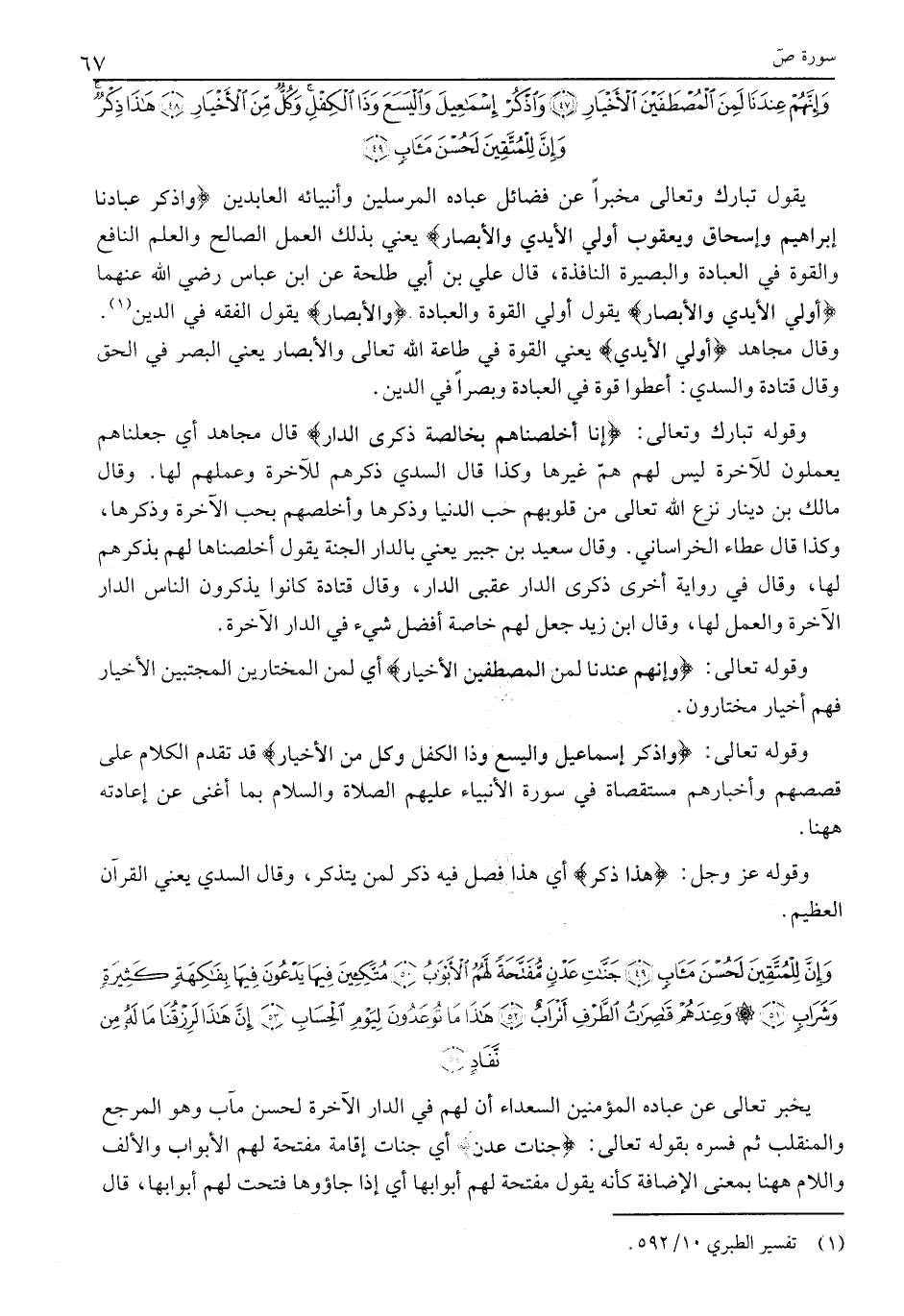 يقول تبارك وتعالى مُخْبِرًا عَنْ فَضَائِلَ عِبَادِهِ الْمُرْسَلِينَ وَأَنْبِيَائِهِ الْعَابِدِينَ وَاذْكُرْ عِبادَنا إِبْراهِيمَ وَإِسْحاقَ وَيَعْقُوبَ أُولِي الْأَيْدِي وَالْأَبْصارِ يَعْنِي بِذَلِكَ الْعَمَلَ الصَّالِحَ وَالْعِلْمَ النَّافِعَ وَالْقُوَّةَ فِي الْعِبَادَةِ وَالْبَصِيرَةَ النَّافِذَةَ، قَالَ عَلِيُّ بْنُ أَبِي طَلْحَةَ عَنِ ابْنِ عَبَّاسٍ رَضِيَ الله عنهما أُولِي الْأَيْدِي وَالْأَبْصارِ يقول أولي القوة والعبادة. وَالْأَبْصارِ يَقُولُ الْفِقْهِ فِي الدِّينِ «1» .