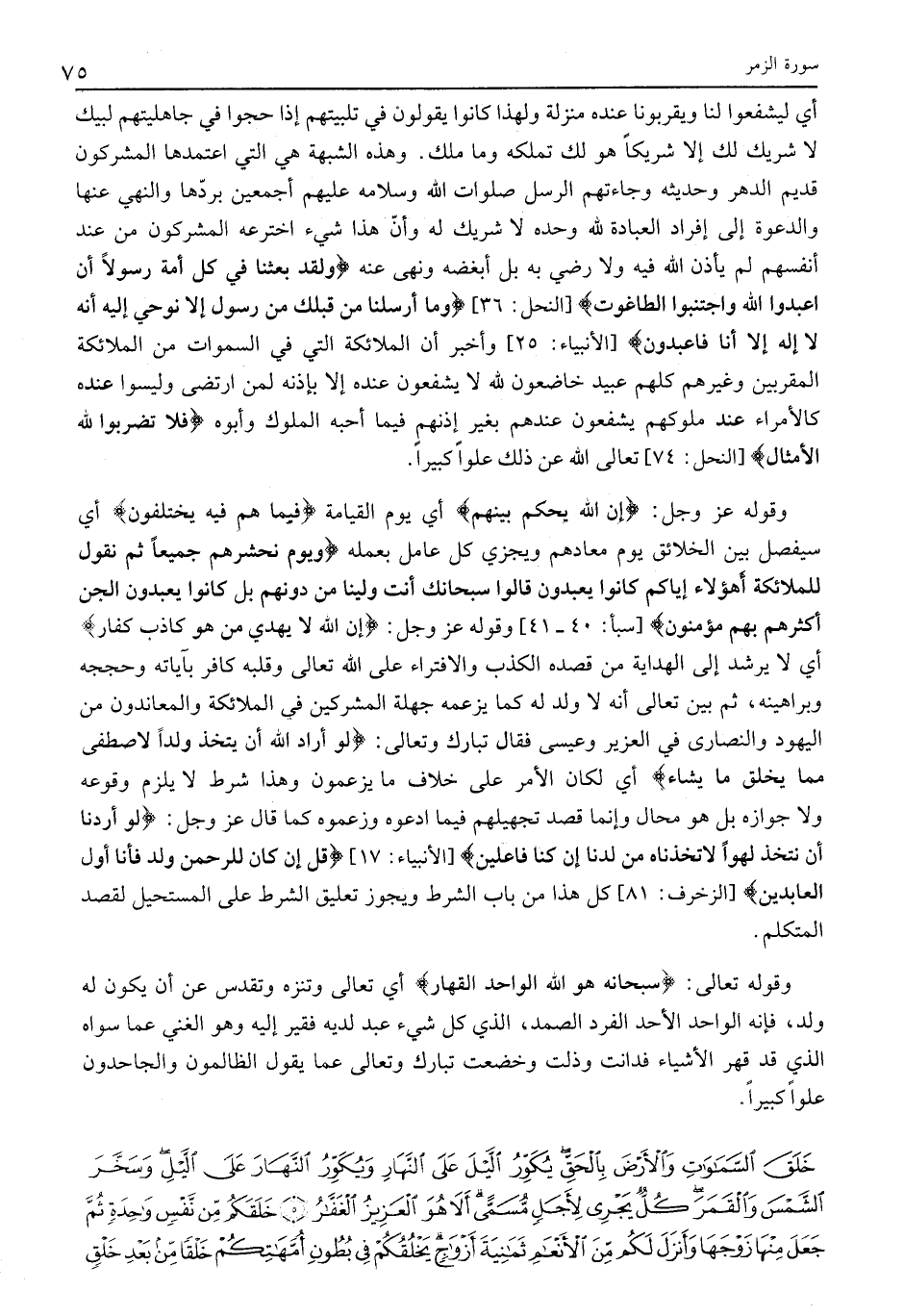 خَلَقَ السَّماواتِ وَالْأَرْضَ بِالْحَقِّ يُكَوِّرُ اللَّيْلَ عَلَى النَّهارِ وَيُكَوِّرُ النَّهارَ عَلَى اللَّيْلِ وَسَخَّرَ الشَّمْسَ وَالْقَمَرَ كُلٌّ يَجْرِي لِأَجَلٍ مُسَمًّى أَلا هُوَ الْعَزِيزُ الْغَفَّارُ (5) خَلَقَكُمْ مِنْ نَفْسٍ واحِدَةٍ ثُمَّ جَعَلَ مِنْها زَوْجَها وَأَنْزَلَ لَكُمْ مِنَ الْأَنْعامِ ثَمانِيَةَ أَزْواجٍ يَخْلُقُكُمْ فِي بُطُونِ أُمَّهاتِكُمْ خَلْقاً مِنْ بَعْدِ خَلْقٍ فِي ظُلُماتٍ ثَلاثٍ ذلِكُمُ اللَّهُ رَبُّكُمْ لَهُ الْمُلْكُ لَا إِلهَ إِلاَّ هُوَ فَأَنَّى تُصْرَفُونَ (6)