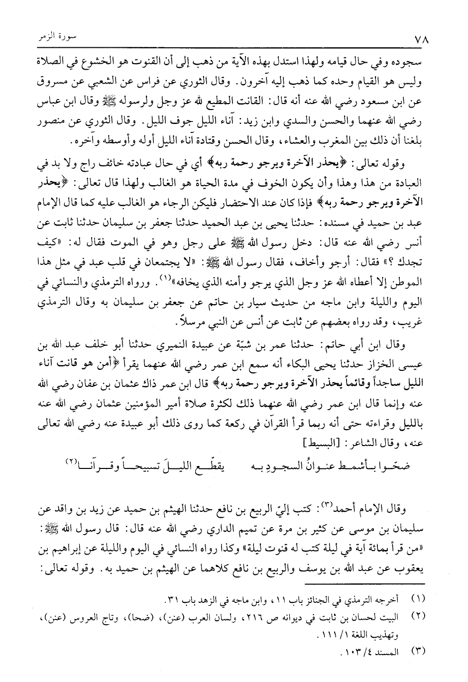 وَقَالَ ابْنُ أَبِي حَاتِمٍ: حَدَّثَنَا عُمَرُ بْنُ شَبَّةَ عَنْ عُبَيْدَةَ النُّمَيْرِيِّ حَدَّثَنَا أَبُو خَلَفٍ عَبْدُ اللَّهِ بْنُ عِيسَى الْخَزَّازُ حَدَّثَنَا يحيى البكاء أنه سمع ابن عمر رضي الله عنهما يقرأ أَمَّنْ هُوَ قانِتٌ آناءَ اللَّيْلِ ساجِداً وَقائِماً يَحْذَرُ الْآخِرَةَ وَيَرْجُوا رَحْمَةَ رَبِّهِ قَالَ ابْنُ عُمَرَ ذَاكَ عُثْمَانُ بْنُ عَفَّانَ رَضِيَ اللَّهُ عَنْهُ وَإِنَّمَا قَالَ ابن عمر رضي الله عنهما ذلك لكثرة صلاة أمير المؤمنين عثمان رضي الله عنه بِاللَّيْلِ وَقِرَاءَتِهِ حَتَّى إِنَّهُ رُبَّمَا قَرَأَ الْقُرْآنَ فِي رَكْعَةٍ كَمَا رَوَى ذَلِكَ أَبُو عُبَيْدَةَ عنه رضي الله تعالى عنه، وقال الشاعر: [البسيط]