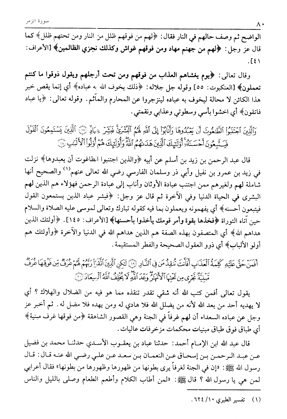 قَالَ عَبْدُ الرَّحْمَنِ بْنُ زَيْدِ بْنِ أَسْلَمَ عَنْ أَبِيهِ وَالَّذِينَ اجْتَنَبُوا الطَّاغُوتَ أَنْ يَعْبُدُوها نَزَلَتْ فِي زَيْدِ بْنِ عَمْرِو بْنِ نفيل وأبي ذر وسلمان الفارسي رضي الله تعالى عنهم «1» وَالصَّحِيحُ أَنَّهَا شَامِلَةٌ لَهُمْ وَلِغَيْرِهِمْ مِمَّنِ اجْتَنَبَ عِبَادَةَ الْأَوْثَانِ وَأَنَابَ إِلَى عِبَادَةِ الرَّحْمَنِ فَهَؤُلَاءِ هُمُ الَّذِينَ لَهُمُ الْبُشْرَى فِي الْحَيَاةِ الدُّنْيَا وَفِي الْآخِرَةِ ثم قال عز وجل: فَبَشِّرْ عِبادِ الَّذِينَ يَسْتَمِعُونَ الْقَوْلَ فَيَتَّبِعُونَ أَحْسَنَهُ أي يفهمونه ويعملون بما فيه كقوله تبارك وتعالى لموسى عليه الصلاة والسلام حِينَ آتَاهُ التَّوْرَاةَ فَخُذْها بِقُوَّةٍ وَأْمُرْ قَوْمَكَ يَأْخُذُوا بِأَحْسَنِها [الْأَعْرَافِ: 145] . أُولئِكَ الَّذِينَ هَداهُمُ اللَّهُ أَيِ الْمُتَّصِفُونَ بِهَذِهِ الصِّفَةِ هُمُ الَّذِينَ هَدَاهُمُ الله في الدنيا والآخرة وَأُولئِكَ هُمْ أُولُوا الْأَلْبابِ أي ذو والعقول الصحيحة والفطر المستقيمة.