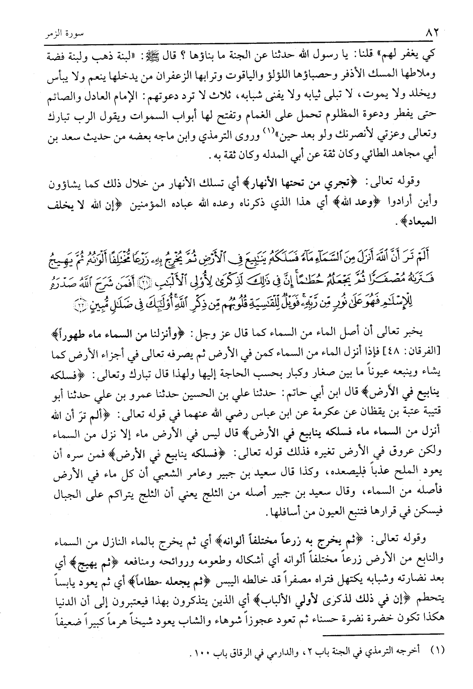 أَلَمْ تَرَ أَنَّ اللَّهَ أَنْزَلَ مِنَ السَّماءِ مَاءً فَسَلَكَهُ يَنابِيعَ فِي الْأَرْضِ ثُمَّ يُخْرِجُ بِهِ زَرْعاً مُخْتَلِفاً أَلْوانُهُ ثُمَّ يَهِيجُ فَتَراهُ مُصْفَرًّا ثُمَّ يَجْعَلُهُ حُطاماً إِنَّ فِي ذلِكَ لَذِكْرى لِأُولِي الْأَلْبابِ (21) أَفَمَنْ شَرَحَ اللَّهُ صَدْرَهُ لِلْإِسْلامِ فَهُوَ عَلى نُورٍ مِنْ رَبِّهِ فَوَيْلٌ لِلْقاسِيَةِ قُلُوبُهُمْ مِنْ ذِكْرِ اللَّهِ أُولئِكَ فِي ضَلالٍ مُبِينٍ (22)