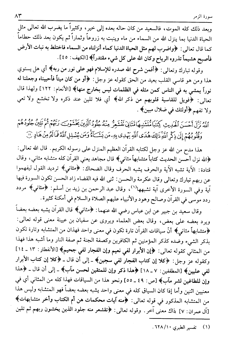 مُتَشابِهاً مَثانِيَ أَنَّ سِيَاقَاتِ الْقُرْآنِ تَارَةً تَكُونُ في معنى واحد فهذان مِنَ الْمُتَشَابِهِ وَتَارَةً تَكُونُ بِذِكْرِ الشَّيْءِ وَضِدِّهِ كَذِكْرِ الْمُؤْمِنِينَ ثُمَّ الْكَافِرِينَ وَكَصِفَةِ الْجَنَّةِ ثُمَّ صِفَةِ النَّارِ وَمَا أَشْبَهَ هَذَا فَهَذَا مِنَ الْمَثَانِي كَقَوْلِهِ تَعَالَى: إِنَّ الْأَبْرارَ لَفِي نَعِيمٍ وَإِنَّ الْفُجَّارَ لَفِي جَحِيمٍ [الانفطار: 13- 14] وكقوله عز وجل: كَلَّا إِنَّ كِتابَ الفُجَّارِ لَفِي سِجِّينٍ- إِلَى أَنْ قَالَ- كَلَّا إِنَّ كِتابَ الْأَبْرارِ لَفِي عِلِّيِّينَ [الْمُطَفِّفِينَ: 7- 18] هَذَا ذِكْرٌ وَإِنَّ لِلْمُتَّقِينَ لَحُسْنَ مَآبٍ- إِلَى أَنْ قَالَ- هَذَا وَإِنَّ لِلطَّاغِينَ لَشَرَّ مَآبٍ [ص: 49- 55] وَنَحْوِ هَذَا مِنَ السِّيَاقَاتِ فَهَذَا كُلُّهُ مِنَ الْمَثَانِي أَيْ فِي مَعْنَيَيْنِ اثْنَيْنِ وَأَمَّا إِذَا كَانَ السِّيَاقُ كُلُّهُ فِي مَعْنًى وَاحِدٍ يُشْبِهُ بَعْضُهُ بَعْضًا فَهُوَ الْمُتَشَابِهُ وَلَيْسَ هذا من المتشابه المذكور في قوله تعالى: مِنْهُ آياتٌ مُحْكَماتٌ هُنَّ أُمُّ الْكِتابِ وَأُخَرُ مُتَشابِهاتٌ [آلِ عِمْرَانَ: 7] ذَاكَ مَعْنًى آخَرُ. وَقَوْلُهُ تعالى: