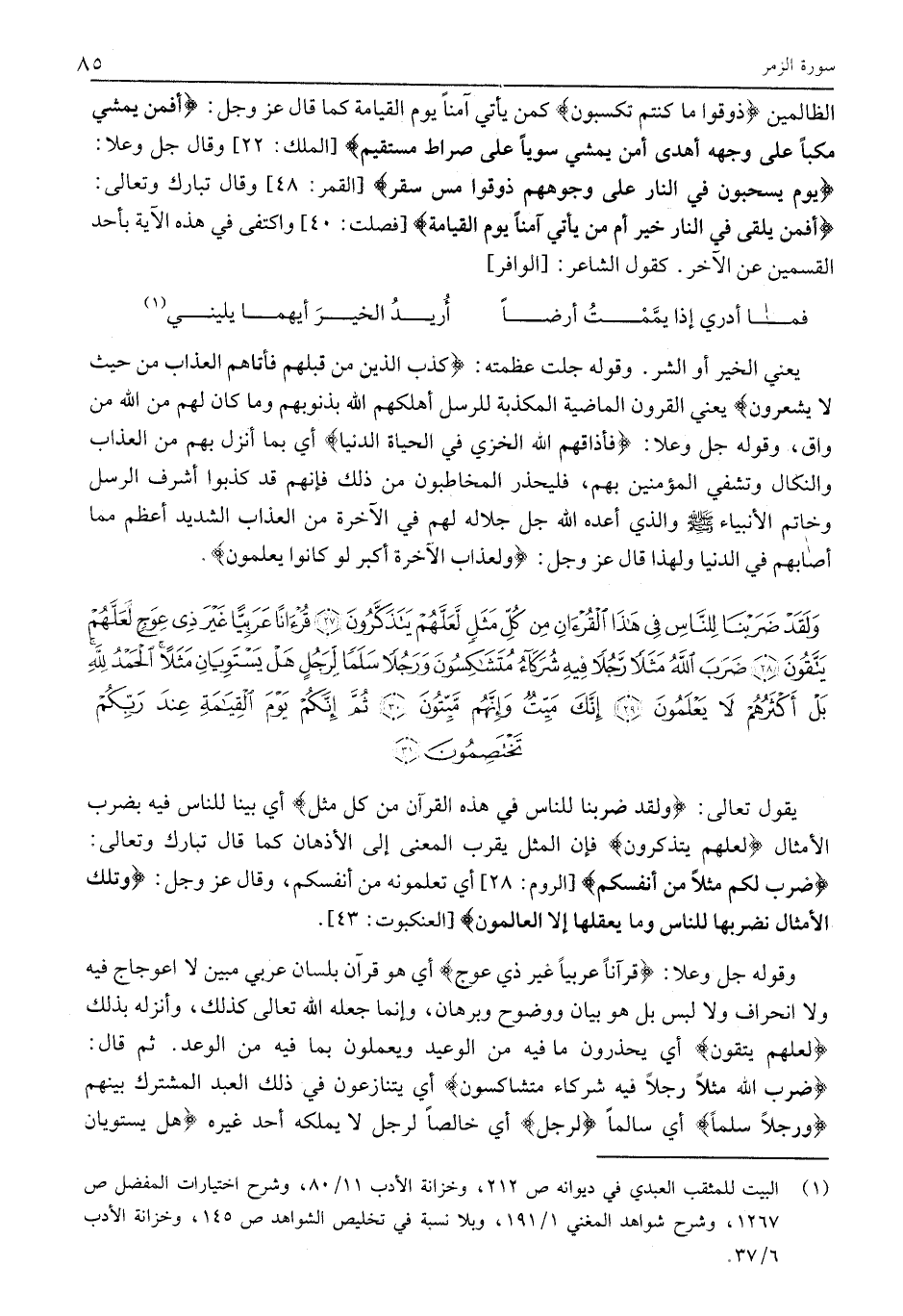 وَلَقَدْ ضَرَبْنا لِلنَّاسِ فِي هذَا الْقُرْآنِ مِنْ كُلِّ مَثَلٍ لَعَلَّهُمْ يَتَذَكَّرُونَ (27) قُرْآناً عَرَبِيًّا غَيْرَ ذِي عِوَجٍ لَعَلَّهُمْ يَتَّقُونَ (28) ضَرَبَ اللَّهُ مَثَلاً رَجُلاً فِيهِ شُرَكاءُ مُتَشاكِسُونَ وَرَجُلاً سَلَماً لِرَجُلٍ هَلْ يَسْتَوِيانِ مَثَلاً الْحَمْدُ لِلَّهِ بَلْ أَكْثَرُهُمْ لَا يَعْلَمُونَ (29) إِنَّكَ مَيِّتٌ وَإِنَّهُمْ مَيِّتُونَ (30) ثُمَّ إِنَّكُمْ يَوْمَ الْقِيامَةِ عِنْدَ رَبِّكُمْ تَخْتَصِمُونَ (31)