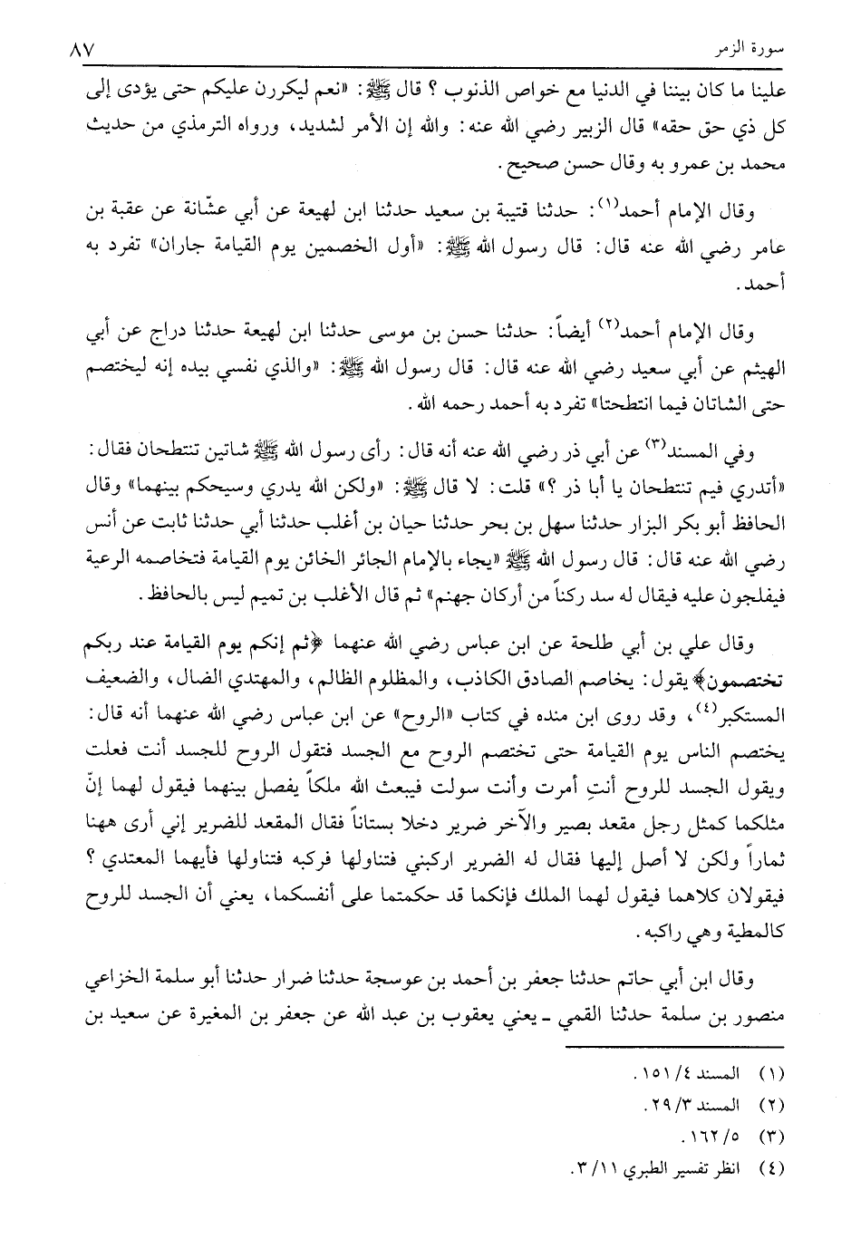 وَقَالَ عَلِيُّ بْنُ أَبِي طَلْحَةَ عَنِ ابْنِ عَبَّاسٍ رَضِيَ اللَّهُ عَنْهُمَا ثُمَّ إِنَّكُمْ يَوْمَ الْقِيامَةِ عِنْدَ رَبِّكُمْ تَخْتَصِمُونَ يَقُولُ: يُخَاصِمُ الصَّادِقُ الكاذب، والمظلوم الظالم، والمهتدي الضَّالَّ، وَالضَّعِيفُ الْمُسْتَكْبِرَ «4» ، وَقَدْ رَوَى ابْنُ مَنْدَهْ في كتاب «الروح» عَنِ ابْنِ عَبَّاسٍ رَضِيَ اللَّهُ عَنْهُمَا أَنَّهُ قَالَ: