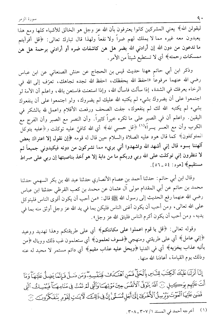 وَذَكَرَ ابْنُ أَبِي حَاتِمٍ هَاهُنَا حَدِيثَ قَيْسِ بْنِ الْحَجَّاجِ عَنْ حَنَشٍ الصَّنْعَانِيِّ عَنِ ابْنِ عباس رضي الله عنهما مَرْفُوعًا «احْفَظِ اللَّهَ يَحْفَظْكَ، احْفَظِ اللَّهَ تَجِدْهُ تُجَاهَكَ، تَعَرَّفْ إِلَى اللَّهِ فِي الرَّخَاءِ يَعْرِفْكَ فِي الشِّدَّةِ، إِذَا سَأَلْتَ فَاسْأَلِ اللَّهَ، وَإِذَا اسْتَعَنْتَ فَاسْتَعِنْ بِاللَّهِ، وَاعْلَمْ أَنَّ الْأُمَّةَ لَوِ اجْتَمَعُوا عَلَى أَنْ يَضُرُّوكَ بِشَيْءٍ لَمْ يَكْتُبْهُ اللَّهُ عَلَيْكَ لَمْ يَضُرُّوكَ، وَلَوِ اجْتَمَعُوا عَلَى أَنْ يَنْفَعُوكَ بِشَيْءٍ لَمْ يَكْتُبْهُ اللَّهُ لَكَ لَمْ يَنْفَعُوكَ، جَفَّتِ الصُّحُفُ وَرُفِعَتِ الْأَقْلَامُ وَاعْمَلْ لله بالشكر في اليقين. واعلم أن في الصبر على ما تكره خيرا كثيرا. وَأَنَّ النَّصْرَ مَعَ الصَّبْرِ وَأَنَّ الْفَرَجَ مَعَ الْكَرْبِ وَأَنَّ مَعَ الْعُسْرِ يُسْرًا» «1» قُلْ حَسْبِيَ اللَّهُ أَيِ اللَّهُ كَافِيَّ عَلَيْهِ تَوَكَّلْتُ وعَلَيْهِ يَتَوَكَّلُ الْمُتَوَكِّلُونَ كما قال هود عليه الصلاة والسلام حِينَ قَالَ لَهُ قَوْمُهُ إِنْ نَقُولُ إِلَّا اعْتَراكَ بَعْضُ آلِهَتِنا بِسُوءٍ قالَ إِنِّي أُشْهِدُ اللَّهَ وَاشْهَدُوا أَنِّي بَرِيءٌ مِمَّا تُشْرِكُونَ مِنْ دُونِهِ فَكِيدُونِي جَمِيعاً ثُمَّ لَا تُنْظِرُونِ إِنِّي تَوَكَّلْتُ عَلَى اللَّهِ رَبِّي وَرَبِّكُمْ مَا مِنْ دَابَّةٍ إِلَّا هُوَ آخِذٌ بِناصِيَتِها إِنَّ رَبِّي عَلى صِراطٍ مُسْتَقِيمٍ [هُودٍ: 54- 56] .