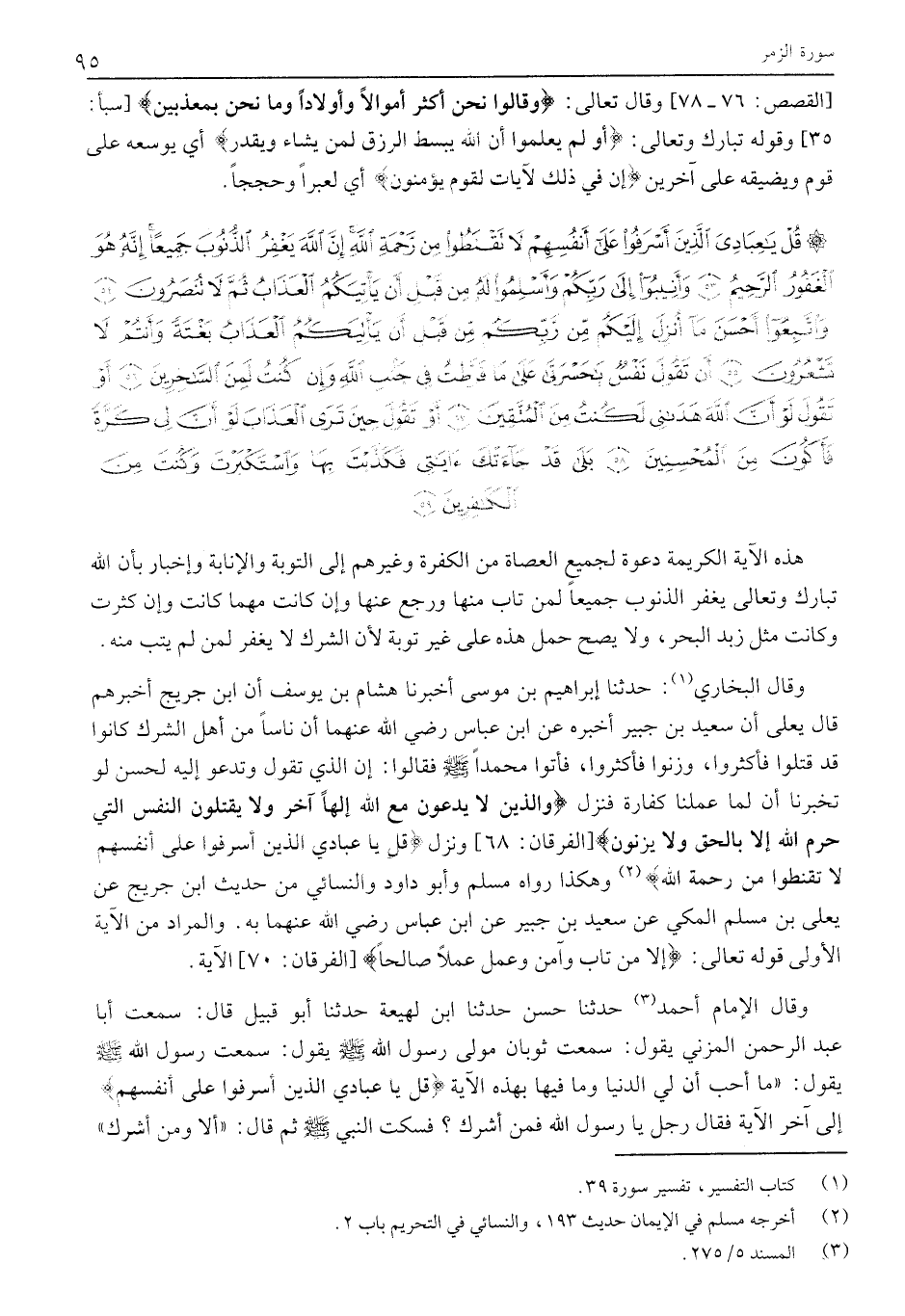 وَقَالَ الْبُخَارِيُّ «1» : حَدَّثَنَا إِبْرَاهِيمُ بْنُ مُوسَى أَخْبَرَنَا هِشَامُ بْنُ يُوسُفَ أَنَّ ابْنَ جُرَيْجٍ أَخْبَرَهُمْ قَالَ يَعْلَى إِنَّ سَعِيدَ بْنَ جُبَيْرٍ أَخْبَرَهُ عَنِ ابْنِ عَبَّاسٍ رَضِيَ اللَّهُ عَنْهُمَا أَنَّ نَاسًا مِنْ أَهْلِ الشِّرْكِ كَانُوا قَدْ قَتَلُوا فَأَكْثَرُوا، وَزَنَوْا فَأَكْثَرُوا، فَأَتَوْا مُحَمَّدًا صَلَّى اللَّهُ عَلَيْهِ وَسَلَّمَ فَقَالُوا: إِنَّ الَّذِي تَقُولُ وَتَدْعُو إِلَيْهِ لَحَسَنٌ لَوْ تُخْبِرُنَا أَنَّ لِمَا عَمِلْنَا كَفَّارَةٌ فَنَزَلَ وَالَّذِينَ لَا يَدْعُونَ مَعَ اللَّهِ إِلهاً آخَرَ وَلا يَقْتُلُونَ النَّفْسَ الَّتِي حَرَّمَ اللَّهُ إِلَّا بِالْحَقِّ وَلا يَزْنُونَ [الفرقان: 68] ونزل قُلْ يَا عِبادِيَ الَّذِينَ أَسْرَفُوا عَلى أَنْفُسِهِمْ لَا تَقْنَطُوا مِنْ رَحْمَةِ اللَّهِ «2» وَهَكَذَا رَوَاهُ مُسْلِمٌ وَأَبُو دَاوُدَ وَالنَّسَائِيُّ مِنْ حَدِيثِ ابْنِ جُرَيْجٍ عَنْ يَعْلَى بْنِ مُسْلِمٍ الْمَكِّيِّ عَنْ سَعِيدِ بْنِ جُبَيْرٍ عَنِ ابْنِ عَبَّاسٍ رَضِيَ الله عنهما به. والمراد من الآية الأولى قوله تعالى: إِلَّا مَنْ تابَ وَآمَنَ وَعَمِلَ عَمَلًا صالِحاً [الفرقان: 70] الآية.
