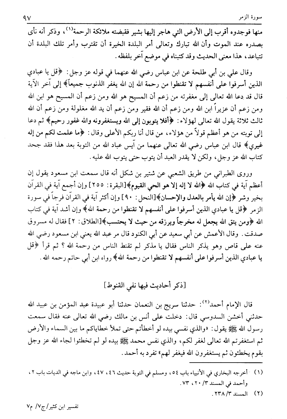 وَقَالَ عَلِيُّ بْنُ أَبِي طَلْحَةَ عَنِ ابْنِ عَبَّاسٍ رَضِيَ الله عنهما في قوله عز وجل: قُلْ يَا عِبادِيَ الَّذِينَ أَسْرَفُوا عَلى أَنْفُسِهِمْ لَا تَقْنَطُوا مِنْ رَحْمَةِ اللَّهِ إِنَّ اللَّهَ يَغْفِرُ الذُّنُوبَ جَمِيعاً إِلَى آخِرِ الْآيَةِ قَالَ قد دعا الله تعالى إِلَى مَغْفِرَتِهِ مَنْ زَعَمَ أَنَّ الْمَسِيحَ هُوَ اللَّهُ وَمَنْ زَعَمَ أَنَّ الْمَسِيحَ هُوَ ابْنُ الله ومن زعم أن عزيزا ابْنُ اللَّهِ وَمَنْ زَعَمَ أَنَّ اللَّهَ فَقِيرٌ وَمَنْ زَعَمَ أَنَّ يَدَ اللَّهِ مَغْلُولَةٌ وَمَنْ زَعَمَ أَنَّ اللَّهَ ثَالِثُ ثَلَاثَةٍ يَقُولُ اللَّهُ تَعَالَى لِهَؤُلَاءِ: أَفَلا يَتُوبُونَ إِلَى اللَّهِ وَيَسْتَغْفِرُونَهُ وَاللَّهُ غَفُورٌ رَحِيمٌ ثُمَّ دَعَا إِلَى تَوْبَتِهِ مَنْ هُوَ أَعْظَمُ قَوْلًا مِنْ هَؤُلَاءِ، مَنْ قَالَ أَنَا رَبُّكُمُ الأعلى وَقَالَ: مَا عَلِمْتُ لَكُمْ مِنْ إِلهٍ غَيْرِي قال ابن عباس رضي الله تعالى عَنْهُمَا مَنْ آيَسَ عِبَادَ اللَّهِ مِنَ التَّوْبَةِ بعد هذا فقد جحد كتاب الله عز وجل، وَلَكِنْ لَا يَقْدِرُ الْعَبْدُ أَنْ يَتُوبَ حَتَّى يَتُوبَ اللَّهُ عَلَيْهِ.
