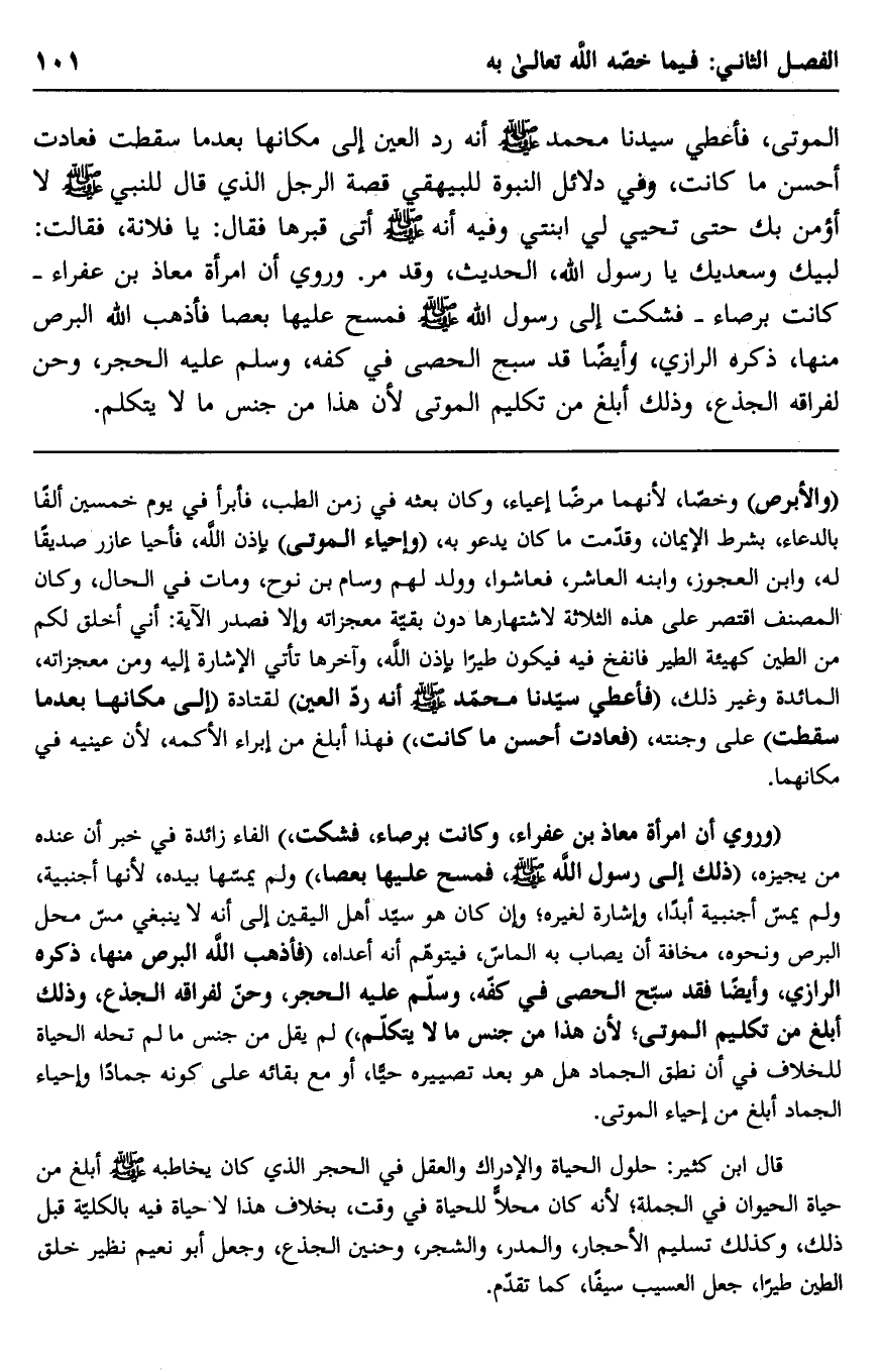 الموتى، فأعطي سيدنا محمد صلى الله عليه وسلم أنه رد العين إلى مكانها بعدما سقطت فعادت أحسن ما كانت، وفي دلائل النبوة للبيهقي قصة الرجل الذي قال للنبي صلى الله عليه وسلم لا أؤمن بك حتى تحيي لي ابنتي وفيه أنه صلى الله عليه وسلم أتى قبرها فقال: "يا فلانة"، فقالت: لبيك وسعديك يا رسول الله، الحديث، وقد مر. وروي أن امرأة معاذ بن عفراء -كانت برصاء- فشكت إلى رسول الله صلى الله عليه وسلم فمسح عليها بعصا فأذهب الله البرص منها، ذكره الرازي، وأيضًا قد سبح الحصى في كفه، وسلم عليه الحجر، وحن لفراقه الجذع، وذلك أبلغ من تكليم الموتى لأن هذا من جنس ما لا يتكلم.