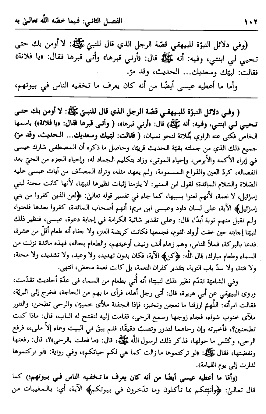 "وفي دلائل النبوة للبيهقي قصة الرجل الذي قال للنبي صلى الله عليه وسلم: لا أومن بك حتى تحيي لي ابنتي، وفيه: أنه صلى الله عليه وسلم" قال: "أرني قبرها"، وأتى قبرها فقال: "يا فلانة" باسمها الخاص فكنى عنه الراوي بفلانة لنحو نسيان، "فقالت: لبيك وسعديك ... الحديث، وقد مر" جميع ذلك الذي من جملته بقية الحديث قريبًا، وحاصل ما ذكره أن المصطفى شارك عيسى في إبراء الأكمه والأبرص، وإحياء الموتى، وزاد بتكليم الجماد له، وإياء الجزء من الحي بعد انفصاله، كرد العين والذراع المسمومة، ولم يعهد مثله، وترك المصنف من آيات عيسى عليه الصلاة والسلام المائدة؛ لقول ابن المنير: لا يلزمنا إثبات نظيرها لنبينا، لأنها كانت محنة لبني إسرائيل، لا نعمة، لأنهم لعنوا بسببها، كما جاء في تفسير قوله تعالى: {لُعِنَ الَّذِينَ كَفَرُوا مِنْ بَنِي إِسْرَائِيلَ} الآية، على لسان داود وعيسى ابن مريم؛ إنهم أصحاب المائدة، كفروا بعدها فلعنوا، ولم تقبل منهم توبة أبدًا، قال: وعلى تقدير شائبة الكرامة في إجابة دعوة عيسى، فنظير ذلك لنبينا إجابته حين خفت أزواد القوم، فجمعها فكانت كربضة العنز، ولا جفاء أنه طعام أقل من عشرة، فدعا بالبركة، فملأ الناس، وهم زهاء ألف ونيف أوعيتهم، والطعام بحاله، فهذه مائدة نزلت من السماء وطعام مبارك، قال الله: {كُنْ} الآية، فكان بدون تهديد، ولا وعيد، ولا تشديد، ولا محنة، ولا فتنة، ولا سد باب التوبة، بتقدير كفران النعمة، بل كانت نعمة محض، انتهى.