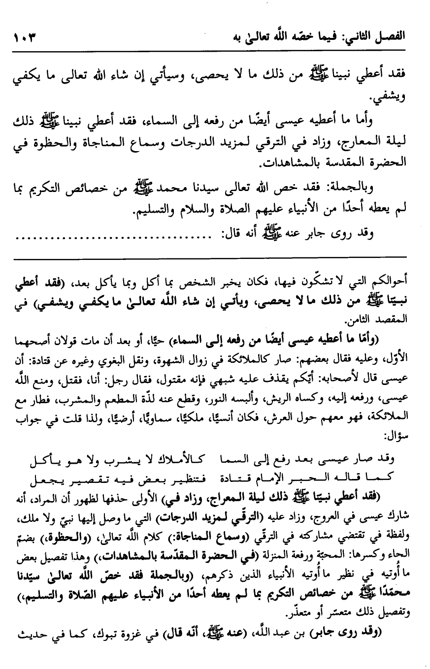 وأما ما أعطيه عيسى أيضًا من رفعه إلى السماء، فقد أعطي نبينا صلى الله عليه وسلم ذلك ليلة المعراج، وزاد في الترقي لمزيد الدرجات وسماع المناجاة والحظوة في الحضرة المقدسة بالمشاهدات.