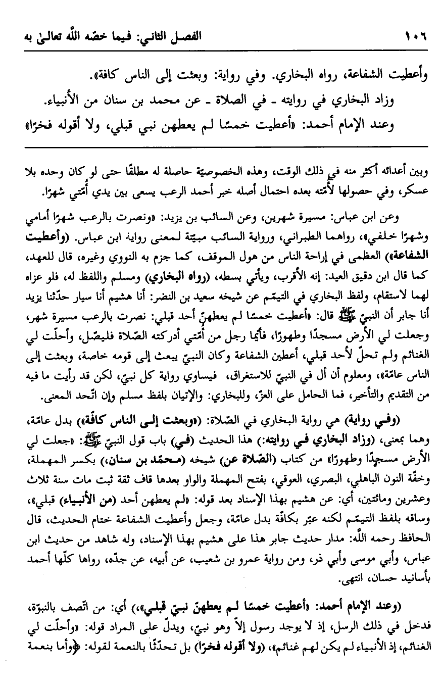 "وعند الإمام أحمد: "أعطيت خمسًا لم يعطهن نبي قبلي" أي: من اتصف بالنبوة، فدخل في ذلك الرسل، إذ لا يوجد رسول إلا وهو نبي، ويدل على المراد قوله: "وأحلت لي الغنائم، إذ الأنبياء لم يكن لهم غنائم"، "ولا أقوله فخرًا" بل تحدثا بالنعمة لقوله: {وَأَمَّا بِنِعْمَةِ