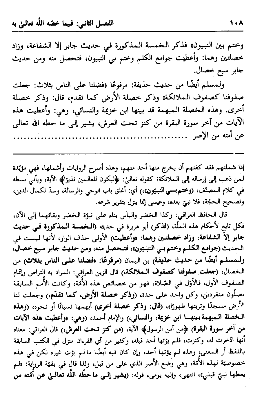 قال الحافظ العراقي: وكذا الخضر وإلياس بناء على نبوة الخضر وبقائهما إلى الآن، فكل تابع لأحكام هذه الملة، "فذكر" أبو هريرة في حديثه "الخمسة المذكورة في حديث جابر إلا الشفاعة، وزاد خصلتين وهما: "وأعطيت" الأولى حذف الواو، لأنها ليست في الحديث "جوامع الكلم وختم بي النبيون" فتحصل منه، ومن حديث جابر سبع خصال، ولمسلم أيضًا من حديث حذيفة" بن اليمان مرفوعًا: "فضلنا على الناس بثلاث" من الخصال "جعلت صفوفنا كصفوف الملائكة" قال الزين العراقي: المراد به التراص وإتمام الصوف الأول، فالأول في الصلاة، فهو من خصائص هذه الأمة، وكانت الأمم السابقة يصلون منفردين، وكل واحد على حدة، "وذكر خصلة الأرض، كما تقدم", "وجعلت لنا الأرض مسجدًا وتربتها طهورًا"، "قال: وذكر خصلة أخرى" أبهمها نسيانًا أو نحوه، "وهذه الخصلة المبهمة بينها ابن خزيمة، والنسائي" والإمام أحمد، وهي: "وأعطيت هذه الآيات في آخر سورة البقرة" {آَمَنَ الرَّسُولُ} الآية، "من كنز تحت العرش" قال العراقي: معناه أنها ادخرت له، وكنزت، فلم يؤتها أحد قبله، وكثير من آي القرآن منزل في الكتب السابقة باللفظ أو المعنى، وهذه لم يؤتها أحد، وإن كان فيه أيضًا ما لم يؤت غيره لكن في هذه خصوصية لهذه الأمة، وهي وضع الإصر الذي على من قبل، ولذا قال في بقية الرواية: "لم يعطها نبي قبلي" انتهى، وإليه يومئ قوله: "يشير إلى ما حطه الله تعالى عن أمته من