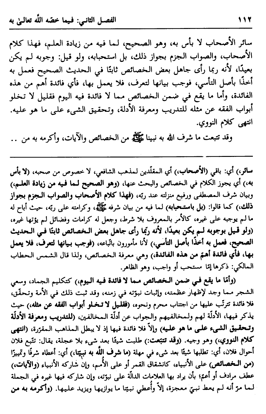 سائر الأصحاب لا بأس به، وهو الصحيح، لما فيه من زيادة العلم، فهذا كلام الأصحاب، والصواب الجزم بجواز ذلك، بل استحبابه، ولو قيل: وجوبه لم يكن بعيدًا، لأنه ربما رأى جاهل بعض الخصائص ثابتًا في الحديث الصحيح فعمل به أخذًا بأصل التأسي، فوجب بيانها لتعرف، فلا يعمل بها، فأي فائدة أهم من هذه الفائدة، وأما ما يقع في ضمن الخصائص مما لا فائدة فيه اليوم فقليل لا تخلو أبواب الفقه عن مثله للتدريب ومعرفة الأدلة، وتحقيق الشيء على ما هو عليه. انتهى كلام النووي وقد تتبعت ما شرف الله به نبينا صلى الله عليه وسلم من الخصائص والآيات، وأكرمه به من