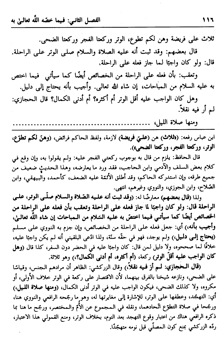 ولذا "قال بعضهم" معارضًا له: "وقد ثبت أنه عليه الصلاة والسلام صلى الوتر، على الراحلة قال: ولو كان واجبًا لما جاز فعله على الراحلة وتعقب بأن فعله على الراحلة من الخائص أيضًا كما سيأتي فيما اختص به عليه السلام من المباحات إن شاء الله تعالى، وأجيب بأنه" أي: جعل فعله على الراحلة من الخصائص، وإن جزم به النووي على مسلم "يحتاج إلى دليل" ولم يوجد، فهو في حقه سنة، ولذا ادعى البلقيني أنه لم يكن واجبًا عليه، خلافًا لما صححوه، ولا دليل لمن قال: كان واجبًا عليه في الحضر دون السفر، كذا قال "وهل كان الواجب عليه أقل الوتر" ركعة، "أم أكثره، أم أدنى الكمال" وهو ثلاثة.