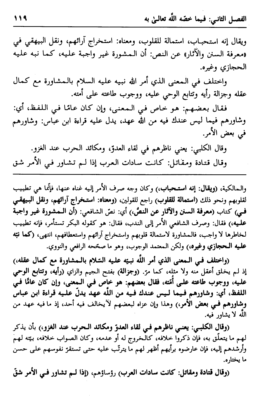 ويقال إنه استحباب، استمالة للقلوب، ومعناه: استخراج آرائهم، ونقل البيهقي في "معرفة السنن والآثار" عن النص: أن المشورة غير واجبة عليه، كما نبه عليه الحجازي وغيره.