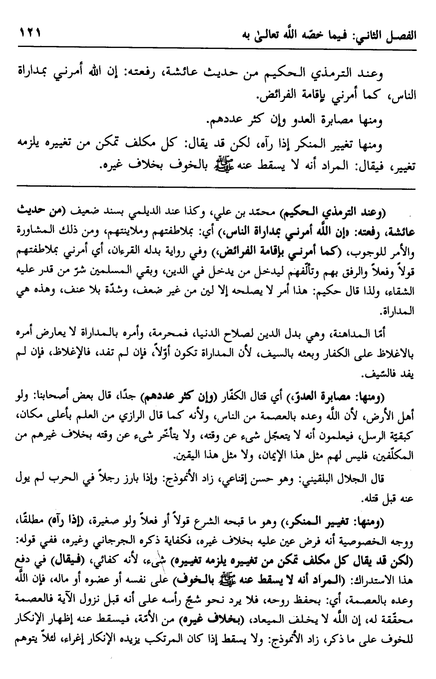 ومنها تغيير المنكر إذا رآه، لكن قد يقال: كل مكلف تمكن من تغييره يلزمه تغيير، فيقال: المراد أنه لا يسقط عنه صلى الله عليه وسلم بالخوف بخلاف غيره.