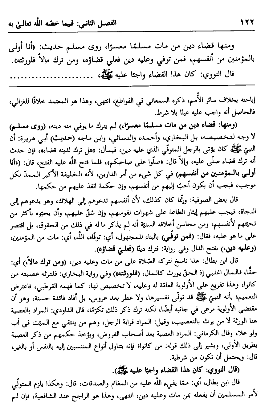 "ومنها: قضاء دين من مات مسلمًا معسرًا" لم يترك ما يوفي منه دينه، "روى مسلم" لا وجه لتخصيصه، بل البخاري، وأحمد، والنسائي، وابن ماجه "حديث" أبي هريرة: أن النبي صلى الله عليه وسلم كان يؤتى بالرجل المتوفى الذي عليه دين، فيسأل: "هل ترك لدينه قضاء"، فإن حدث أنه ترك قضاء صلى عليه، وإلا قال: "صلوا على صاحبكم" فلما فتح الله عليه الفتح، قال: "أنا أولى بالمؤمنين من أنفسهم" في كل شيء من أمر الدارين، لأنه الخليفة الأكبر الممد لكل موجب، فيجب أن يكون أحب من أنفسهم، وإن حكمه أنفذ عليهم من حكمها.