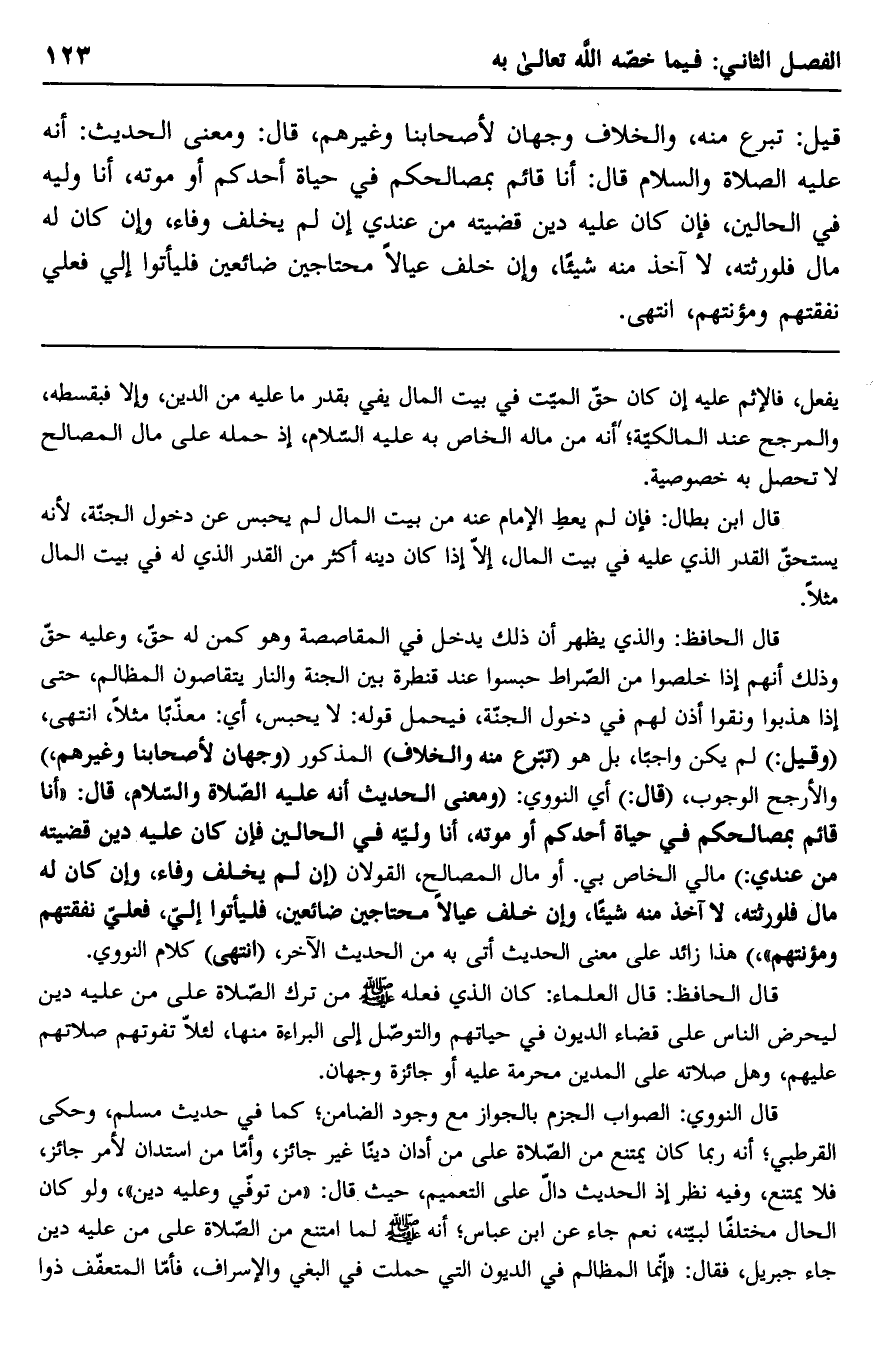 قيل: تبرع منه، والخلاف وجهان لأصحابنا وغيرهم، قال: ومعنى الحديث: أنه عليه الصلاة والسلام قال: أنا قائم بمصالحكم في حياة أحدكم أو موته، أنا وليه في الحالين، فإن كان عليه دين قضيته من عندي إن لم يخلف وفاء، وإن كان له مال فلورثته، لا آخذ منه شيئًا، وإن خلف عيالا محتاجين ضائعين فليأتوا إلي فعلي نفقتهم ومؤنتهم، انتهى.
